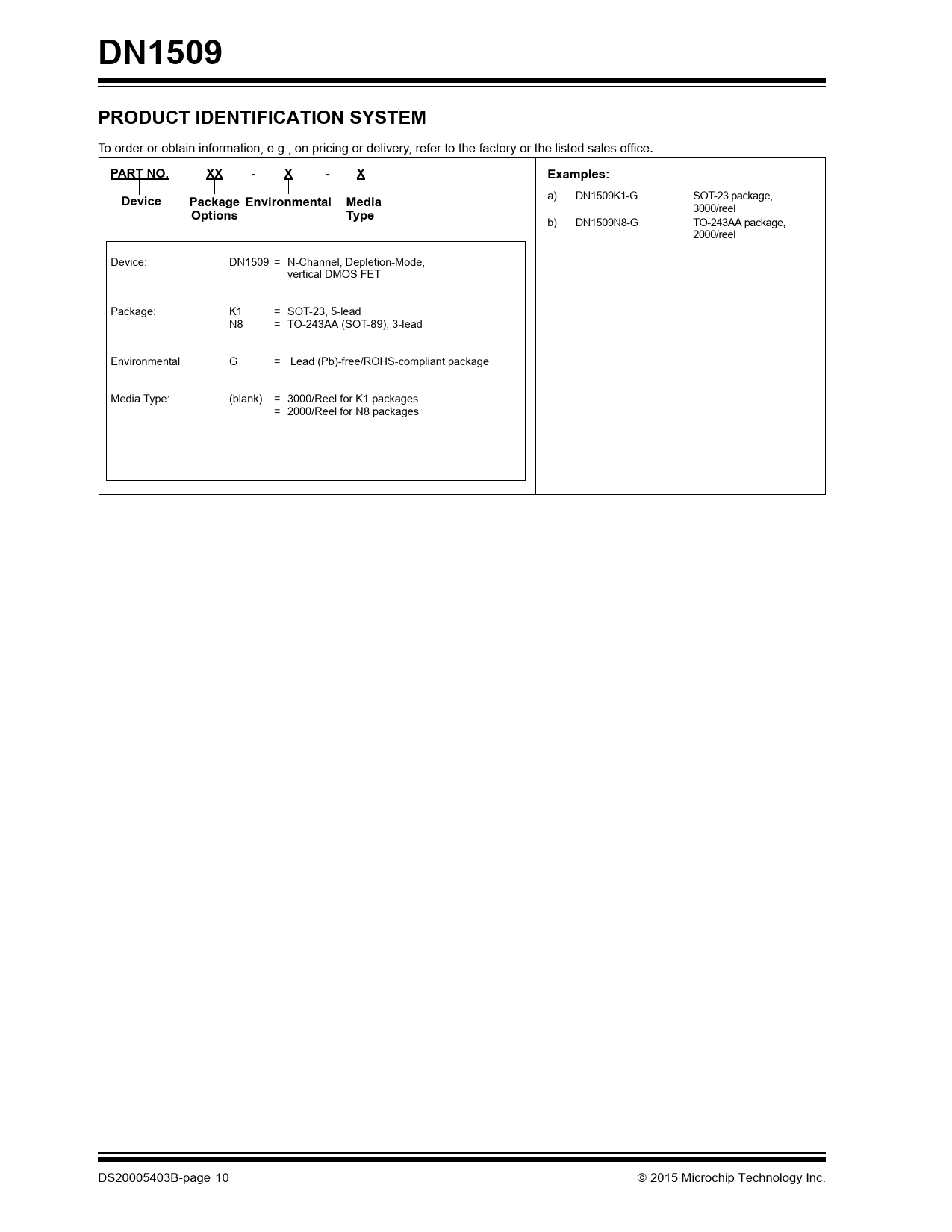 DN1509PRODUCT IDENTIFICATION SYSTEM To order or obtain information, e.g., on pricing or delivery, refer to the factory or the listed sales office. PART NO.XX-X-XExamples: a) DN1509K1-G SOT-23 package, DevicePackage EnvironmentalMedia 3000/reel OptionsType b) DN1509N8-G TO-243AA package, 2000/reel Device: DN1509 = N-Channel, Depletion-Mode, vertical DMOS FET Package: K1 = SOT-23, 5-lead N8 = TO-243AA (SOT-89), 3-lead Environmental G = Lead (Pb)-free/ROHS-compliant package Media Type: (blank) = 3000/Reel for K1 packages = 2000/Reel for N8 packages DS20005403B-page 10 2015 Microchip Technology Inc. Document Outline 1.0 Electrical Characteristics 1.1 Electrical Specifications TABLE 1-1: DC and AC Characteristics TABLE 1-2: Typical Thermal Resistance TABLE 1-3: Thermal characteristics 2.0 Pin Description TABLE 2-1: Pin Description 3.0 Application Information FIGURE 3-1: Switching Waveforms and Test Circuit 4.0 Packaging Information 4.1 Package Marking Information AMERICAS Corporate Office Atlanta Austin, TX Boston Chicago Cleveland Dallas Detroit Houston, TX Indianapolis Los Angeles New York, NY San Jose, CA Canada - Toronto ASIA/PACIFIC Asia Pacific Office Hong Kong Australia - Sydney China - Beijing China - Chengdu China - Chongqing China - Dongguan China - Hangzhou China - Hong Kong SAR China - Nanjing China - Qingdao China - Shanghai China - Shenyang China - Shenzhen China - Wuhan China - Xian ASIA/PACIFIC China - Xiamen China - Zhuhai India - Bangalore India - New Delhi India - Pune Japan - Osaka Japan - Tokyo Korea - Daegu Korea - Seoul Malaysia - Kuala Lumpur Malaysia - Penang Philippines - Manila Singapore Taiwan - Hsin Chu Taiwan - Kaohsiung Taiwan - Taipei Thailand - Bangkok EUROPE Austria - Wels Denmark - Copenhagen France - Paris Germany - Dusseldorf Germany - Karlsruhe Germany - Munich Italy - Milan Italy - Venice Netherlands - Drunen Poland - Warsaw Spain - Madrid Sweden - Stockholm UK - Wokingham