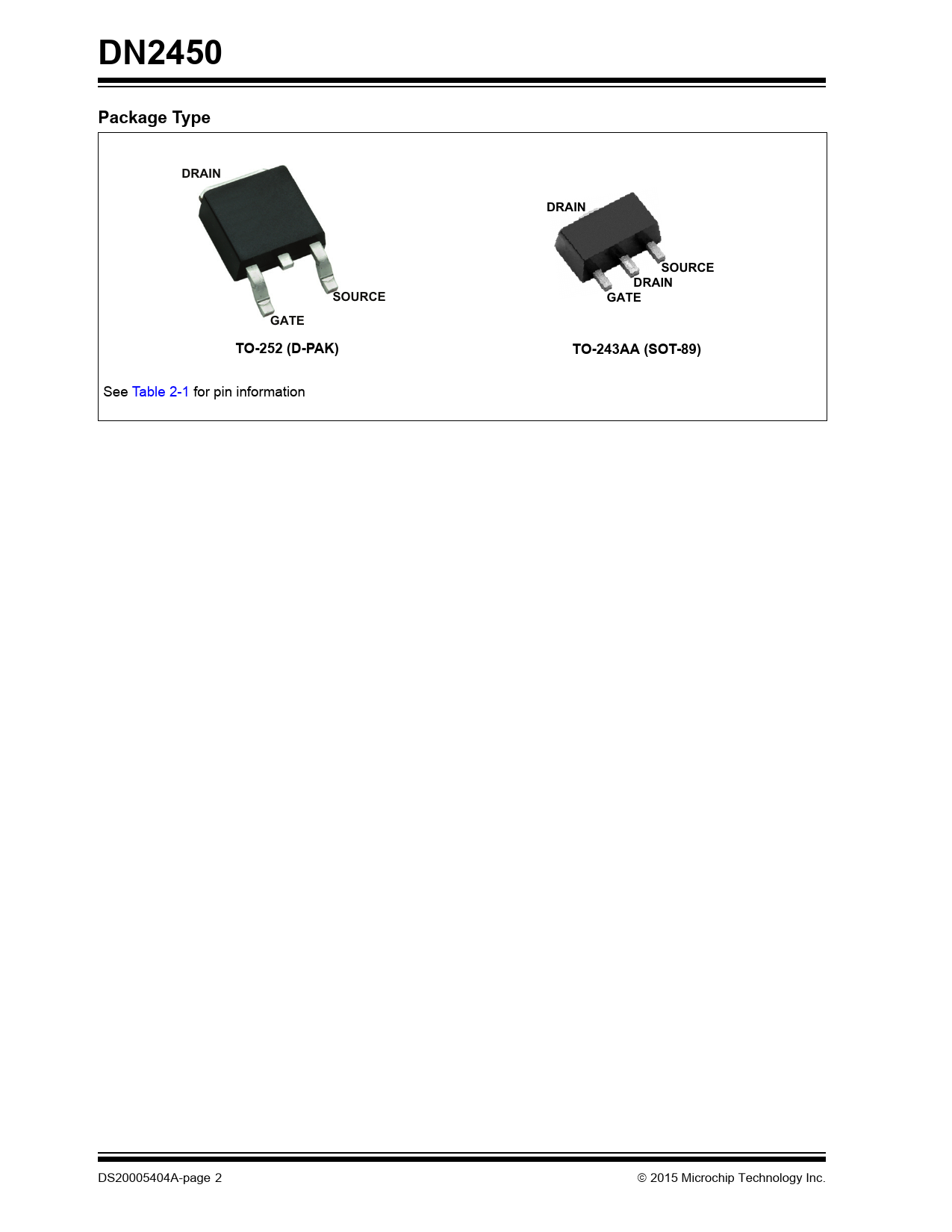 DN2450. Package Type. DRAIN. SOURCE. GATE. TO-252 (D-PAK). TO-243AA (SOT-89)