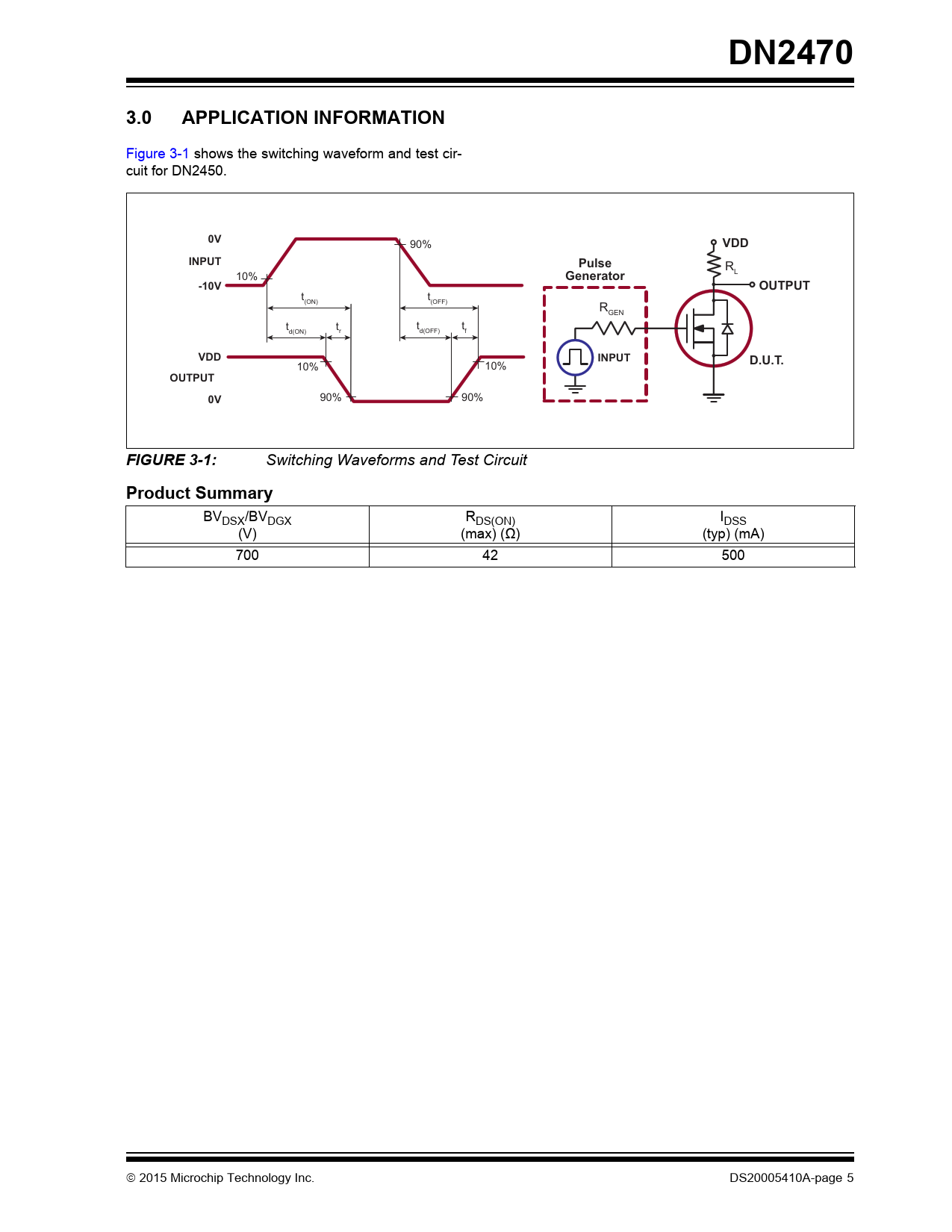 DN2470. 3.0. APPLICATION INFORMATION. VDD. INPUT. Pulse. Generator. -10V. OUTPUT. D.U.T. FIGURE 3-1:. Product Summary