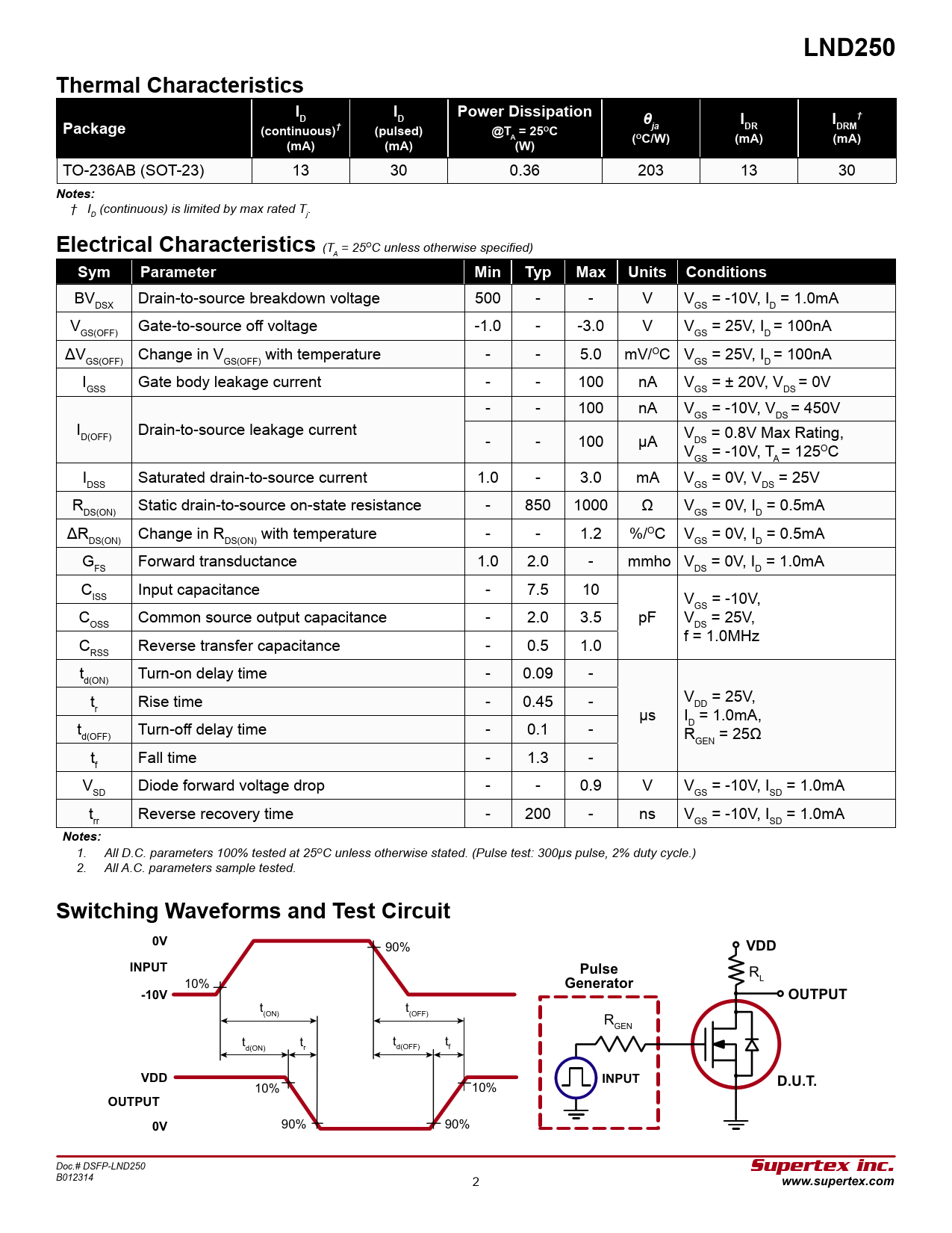 BV Drain-to-source breakdown voltage 500 - - V V = -10V, I = 1.0mA DSX GS D V Gate-to-source off voltage -1.0 - -3.0 V V = 25V, I = 100nA GS(OFF) GS D ΔV Change in V with temperature - - 5.0 mV/OC V = 25V, I = 100nA GS(OFF) GS(OFF) GS D I Gate body leakage current - - 100 nA V = ± 20V, V = 0V GSS GS DS - - 100 nA V = -10V, V = 450V GS DS I Drain-to-source leakage current D(OFF) - - 100 µA V = 0.8V Max Rating, DS V = -10V, T = 125OC GS A I Saturated drain-to-source current 1.0 - 3.0 mA V = 0V, V = 25V DSS GS DS R Static drain-to-source on-state resistance - 850 1000 Ω V = 0V, I = 0.5mA DS(ON) GS D ΔR Change in R with temperature - - 1.2 %/OC V = 0V, I = 0.5mA DS(ON) DS(ON) GS D G Forward transductance 1.0 2.0 - mmho V = 0V, I = 1.0mA FS DS D C Input capacitance - 7.5 10 ISS V = -10V, GS C Common source output capacitance - 2.0 3.5 pF V = 25V, OSS DS f = 1.0MHz C Reverse transfer capacitance - 0.5 1.0 RSS t Turn-on delay time - 0.09 - d(ON) V = 25V, t Rise time - 0.45 - DD r µs I = 1.0mA, D t Turn-off delay time - 0.1 - d(OFF) R = 25Ω GEN t Fall time - 1.3 - f V Diode forward voltage drop - - 0.9 V V = -10V, I = 1.0mA SD GS SD t Reverse recovery time - 200 - ns V = -10V, I = 1.0mA rr GS SD