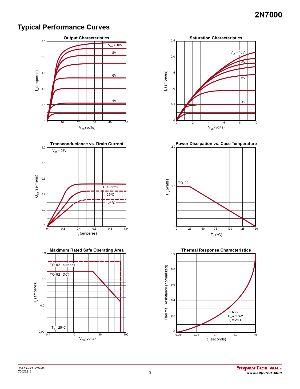 1.0 1.0 TO-92 (pulsed) 0.8 TO-92 (DC) 0.1 0.6 (amperes) 0.4 I D 0.01 TO-92 0.2 P = 1.0W D Thermal Resistance (normalized) T = 25OC C T = 25OC C 0.001 0 0.1 1.0 10 100 0.001 0.01 0.1 1.0 10 V (volts) DS t (seconds) p Doc.# DSFP-2N7000