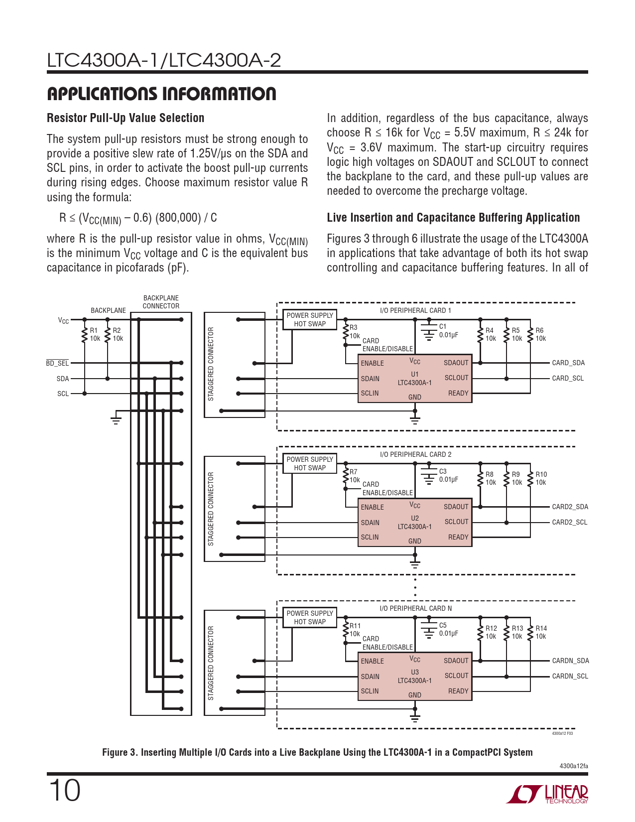 where R is the pull-up resistor value in ohms, VCC(MIN) Figures 3 through 6 illustrate the usage of the LTC4300A is the minimum VCC voltage and C is the equivalent bus in applications that take advantage of both its hot swap capacitance in picofarads (pF). controlling and capacitance buffering features. In all of BACKPLANE CONNECTOR BACKPLANE I/O PERIPHERAL CARD 1 POWER SUPPLY VCC HOT SWAP R3 C1 R1 R2 R4 R5 R6 10k 0.01μF 10k 10k CARD 10k 10k 10k ENABLE/DISABLE BD_SEL ENABLE VCC SDAOUT CARD_SDA U1 SDA SDAIN SCLOUT CARD_SCL LTC4300A-1 AGGERED CONNECTOR SCL SCLIN READY ST GND I/O PERIPHERAL CARD 2 POWER SUPPLY HOT SWAP R7 C3 R8 R9 R10 10k 0.01μF 10k 10k 10k CARD ENABLE/DISABLE ENABLE VCC SDAOUT CARD2_SDA U2 SDAIN SCLOUT CARD2_SCL LTC4300A-1 AGGERED CONNECTOR SCLIN READY GND ST ttt I/O PERIPHERAL CARD N POWER SUPPLY HOT SWAP R11 C5 R12 R13 R14 10k 0.01μF 10k 10k 10k CARD ENABLE/DISABLE ENABLE VCC SDAOUT CARDN_SDA U3 SDAIN SCLOUT CARDN_SCL LTC4300A-1 AGGERED CONNECTOR SCLIN READY GND ST 4300a12 F03