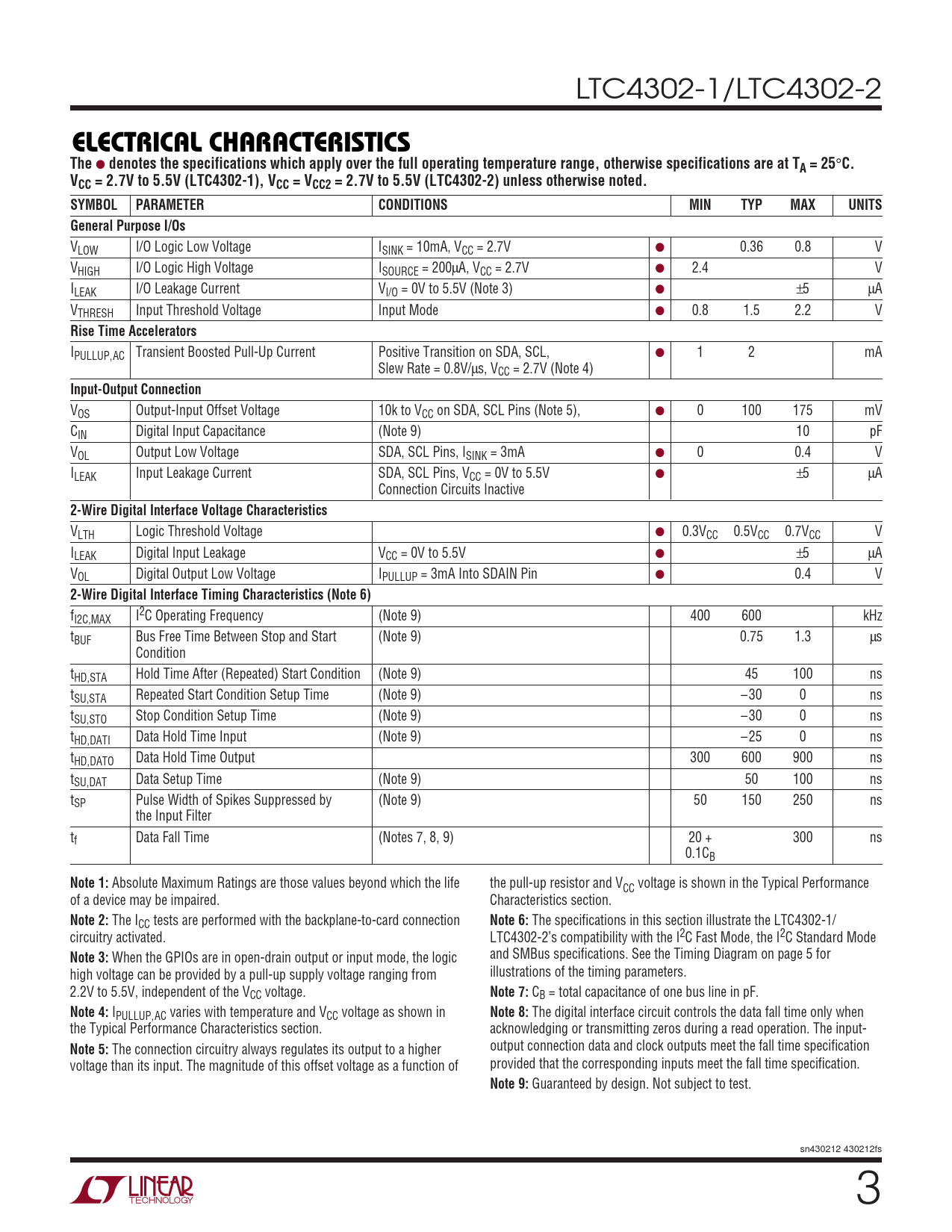 LTC4302-1/LTC4302-2 ELECTRICAL CHARACTERISTICSThe ● denotes the specifications which apply over the full operating temperature range, otherwise specifications are at TA = 25 ° C.VCC = 2.7V to 5.5V (LTC4302-1), VCC = VCC2 = 2.7V to 5.5V (LTC4302-2) unless otherwise noted. SYMBOLPARAMETERCONDITIONSMINTYPMAXUNITSGeneral Purpose I/Os VLOW I/O Logic Low Voltage ISINK = 10mA, VCC = 2.7V ● 0.36 0.8 V VHIGH I/O Logic High Voltage ISOURCE = 200µA, VCC = 2.7V ● 2.4 V ILEAK I/O Leakage Current VI/O = 0V to 5.5V (Note 3) ● ±5 µA VTHRESH Input Threshold Voltage Input Mode ● 0.8 1.5 2.2 V Rise Time Accelerators IPULLUP,AC Transient Boosted Pull-Up Current Positive Transition on SDA, SCL, ● 1 2 mA Slew Rate = 0.8V/µs, VCC = 2.7V (Note 4) Input-Output Connection VOS Output-Input Offset Voltage 10k to VCC on SDA, SCL Pins (Note 5), ● 0 100 175 mV CIN Digital Input Capacitance (Note 9) 10 pF VOL Output Low Voltage SDA, SCL Pins, ISINK = 3mA ● 0 0.4 V ILEAK Input Leakage Current SDA, SCL Pins, VCC = 0V to 5.5V ● ±5 µA Connection Circuits Inactive 2-Wire Digital Interface Voltage Characteristics VLTH Logic Threshold Voltage ● 0.3VCC 0.5VCC 0.7VCC V ILEAK Digital Input Leakage VCC = 0V to 5.5V ● ±5 µA VOL Digital Output Low Voltage IPULLUP = 3mA Into SDAIN Pin ● 0.4 V 2-Wire Digital Interface Timing Characteristics (Note 6) fI2C,MAX I2C Operating Frequency (Note 9) 400 600 kHz tBUF Bus Free Time Between Stop and Start (Note 9) 0.75 1.3 µs Condition tHD,STA Hold Time After (Repeated) Start Condition (Note 9) 45 100 ns tSU,STA Repeated Start Condition Setup Time (Note 9) –30 0 ns tSU,STO Stop Condition Setup Time (Note 9) –30 0 ns tHD,DATI Data Hold Time Input (Note 9) –25 0 ns tHD,DATO Data Hold Time Output 300 600 900 ns tSU,DAT Data Setup Time (Note 9) 50 100 ns tSP Pulse Width of Spikes Suppressed by (Note 9) 50 150 250 ns the Input Filter tf Data Fall Time (Notes 7, 8, 9) 20 + 300 ns 0.1CB Note 1: Absolute Maximum Ratings are those values beyond which the life the pull-up resistor and V voltage is shown in the Typical Performance CC of a device may be impaired. Characteristics section. Note 2: The ICC tests are performed with the backplane-to-card connection Note 6: The specifications in this section illustrate the LTC4302-1/ circuitry activated. LTC4302-2’s compatibility with the I2C Fast Mode, the I2C Standard Mode Note 3: When the GPIOs are in open-drain output or input mode, the logic and SMBus specifications. See the Timing Diagram on page 5 for high voltage can be provided by a pull-up supply voltage ranging from illustrations of the timing parameters. 2.2V to 5.5V, independent of the VCC voltage. Note 7: CB = total capacitance of one bus line in pF. Note 4: IPULLUP,AC varies with temperature and VCC voltage as shown in Note 8: The digital interface circuit controls the data fall time only when the Typical Performance Characteristics section. acknowledging or transmitting zeros during a read operation. The input- Note 5: The connection circuitry always regulates its output to a higher output connection data and clock outputs meet the fall time specification voltage than its input. The magnitude of this offset voltage as a function of provided that the corresponding inputs meet the fall time specification. Note 9: Guaranteed by design. Not subject to test. sn430212 430212fs 3