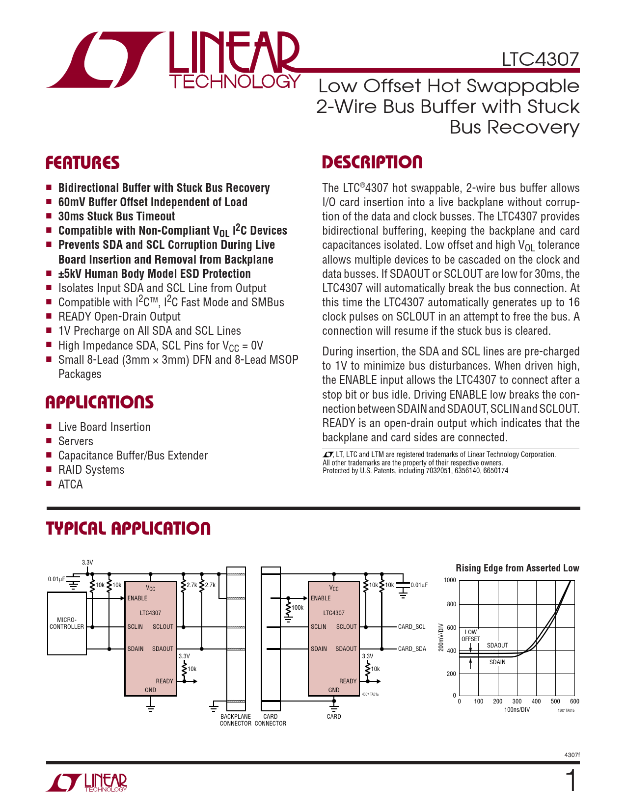 LTC4307 Low Offset Hot Swappable 2-Wire Bus Buffer with Stuck Bus Recovery UFEATURESDESCRIPTIO ■ Bidirectional Buffer with Stuck Bus Recovery The LTC®4307 hot swappable, 2-wire bus buffer allows ■ 60mV Buffer Offset Independent of Load I/O card insertion into a live backplane without corrup- ■ 30ms Stuck Bus Timeout tion of the data and clock busses. The LTC4307 provides ■ Compatible with Non-Compliant VOL I2C Devices bidirectional buffering, keeping the backplane and card ■ Prevents SDA and SCL Corruption During Live capacitances isolated. Low offset and high VOL tolerance Board Insertion and Removal from Backplane allows multiple devices to be cascaded on the clock and ■ ±5kV Human Body Model ESD Protection data busses. If SDAOUT or SCLOUT are low for 30ms, the ■ Isolates Input SDA and SCL Line from Output LTC4307 will automatically break the bus connection. At ■ Compatible with I2CTM, I2C Fast Mode and SMBus this time the LTC4307 automatically generates up to 16 ■ READY Open-Drain Output clock pulses on SCLOUT in an attempt to free the bus. A ■ 1V Precharge on All SDA and SCL Lines connection will resume if the stuck bus is cleared. ■ High Impedance SDA, SCL Pins for VCC = 0V During insertion, the SDA and SCL lines are pre-charged ■ Small 8-Lead (3mm × 3mm) DFN and 8-Lead MSOP to 1V to minimize bus disturbances. When driven high, Packages the ENABLE input allows the LTC4307 to connect after a U stop bit or bus idle. Driving ENABLE low breaks the con- APPLICATIO S nection between SDAIN and SDAOUT, SCLIN and SCLOUT. ■ READY is an open-drain output which indicates that the Live Board Insertion ■ backplane and card sides are connected. Servers ■ Capacitance Buffer/Bus Extender , LT, LTC and LTM are registered trademarks of Linear Technology Corporation. All other trademarks are the property of their respective owners. ■ RAID Systems Protected by U.S. Patents, including 7032051, 6356140, 6650174 ■ ATCA UTYPICAL APPLICATIO 3.3V Rising Edge from Asserted Low 0.01μF 1000 10k 10k V 2.7k 2.7k 10k 10k 0.01μF CC VCC ENABLE ENABLE 800 100k LTC4307 LTC4307 MICRO- CONTROLLER SCLIN SCLOUT SCLIN SCLOUT CARD_SCL 600 LOW OFFSET SDAOUT SDAIN SDAOUT SDAIN SDAOUT CARD_SDA 200mV/DIV 400 3.3V 3.3V SDAIN 10k 10k 200 READY READY GND GND 4307 TA01a 0 0 100 200 300 400 500 600 100ns/DIV 4307 TA01b BACKPLANE CARD CARD CONNECTOR CONNECTOR 4307f 1