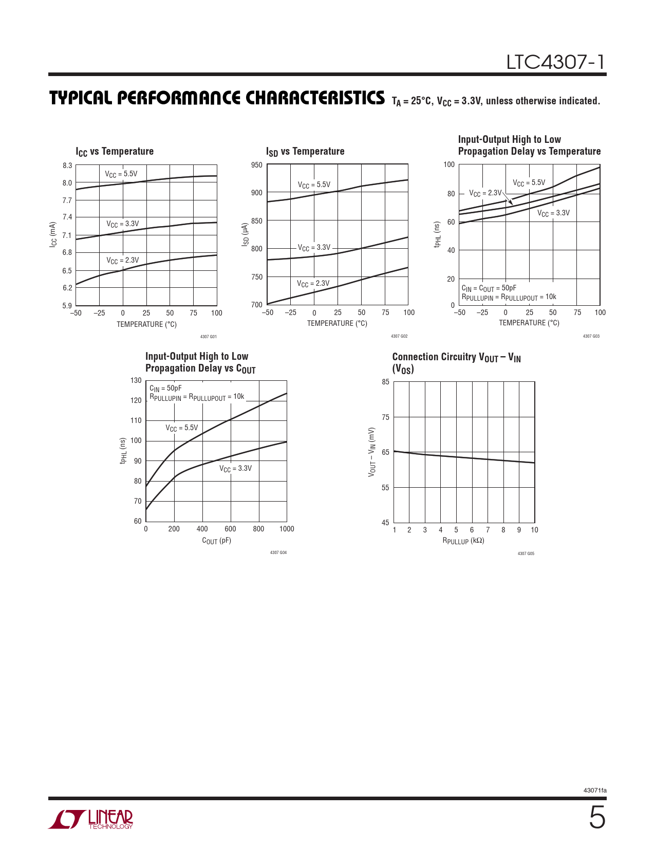 8.3 950 100 VCC = 5.5V 8.0 V V CC = 5.5V CC = 5.5V 900 80 VCC = 2.3V 7.7 V 7.4 CC = 3.3V V 850 60 CC = 3.3V (mA) 7.1 (μA) (ns) I CC I SD V t PHL 6.8 800 CC = 3.3V 40 VCC = 2.3V 6.5 750 20 V 6.2 CC = 2.3V CIN = COUT = 50pF RPULLUPIN = RPULLUPOUT = 10k 5.9 700 0 –50 –25 0 25 50 75 100 –50 –25 0 25 50 75 100 –50 –25 0 25 50 75 100 TEMPERATURE (°C) TEMPERATURE (°C) TEMPERATURE (°C) 4307 G01 4307 G02 4307 G03