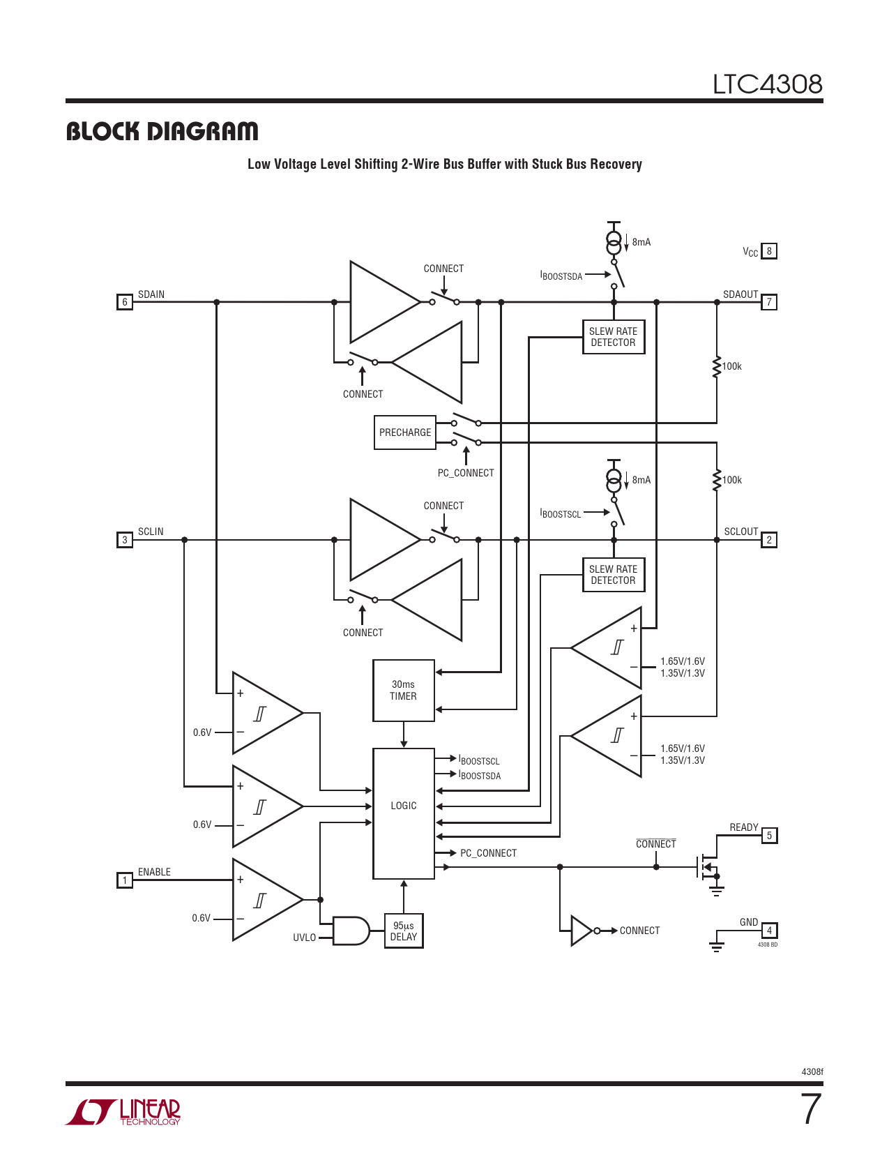 8mA VCC 8 CONNECT IBOOSTSDA SDAIN SDAOUT 6 7 SLEW RATE DETECTOR 100k CONNECT PRECHARGE PC_CONNECT 8mA 100k CONNECT IBOOSTSCL SCLIN SCLOUT 3 2 SLEW RATE DETECTOR + CONNECT 1.65V/1.6V – 1.35V/1.3V 30ms + TIMER + 0.6V – 1.65V/1.6V I – BOOSTSCL 1.35V/1.3V IBOOSTSDA + LOGIC 0.6V – READY 5 CONNECT PC_CONNECT ENABLE 1 + 0.6V – GND 95μs CONNECT 4 UVLO DELAY 4308 BD 4308f 7