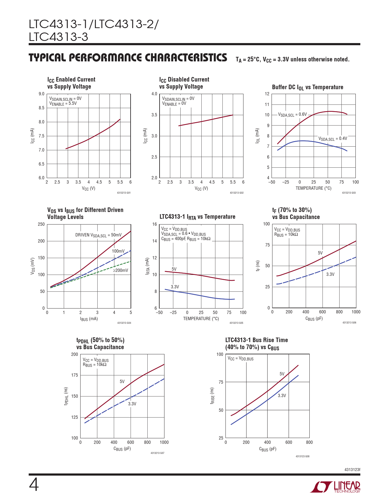 250 16 100 VCC = VDD,BUS VCC = VDD,BUS DRIVEN V V SDA,SCL = 50mV SDA,SCL = 0.6 • VDD,BUS RBUS = 10kΩ 200 14 CBUS = 400pF, RBUS = 10kΩ 75 100mV 5V 150 12 (mV) (mA) 50 5V (ns) t F V OS ≥200mV 100 I RTA 10 3.3V 3.3V 25 50 8 0 6 0 0 1 2 3 4 5 –50 –25 0 25 50 75 100 0 200 400 600 800 1000 IBUS (mA) TEMPERATURE (°C) CBUS (pF) 4313213 G04 4313213 G05 4313213 G06