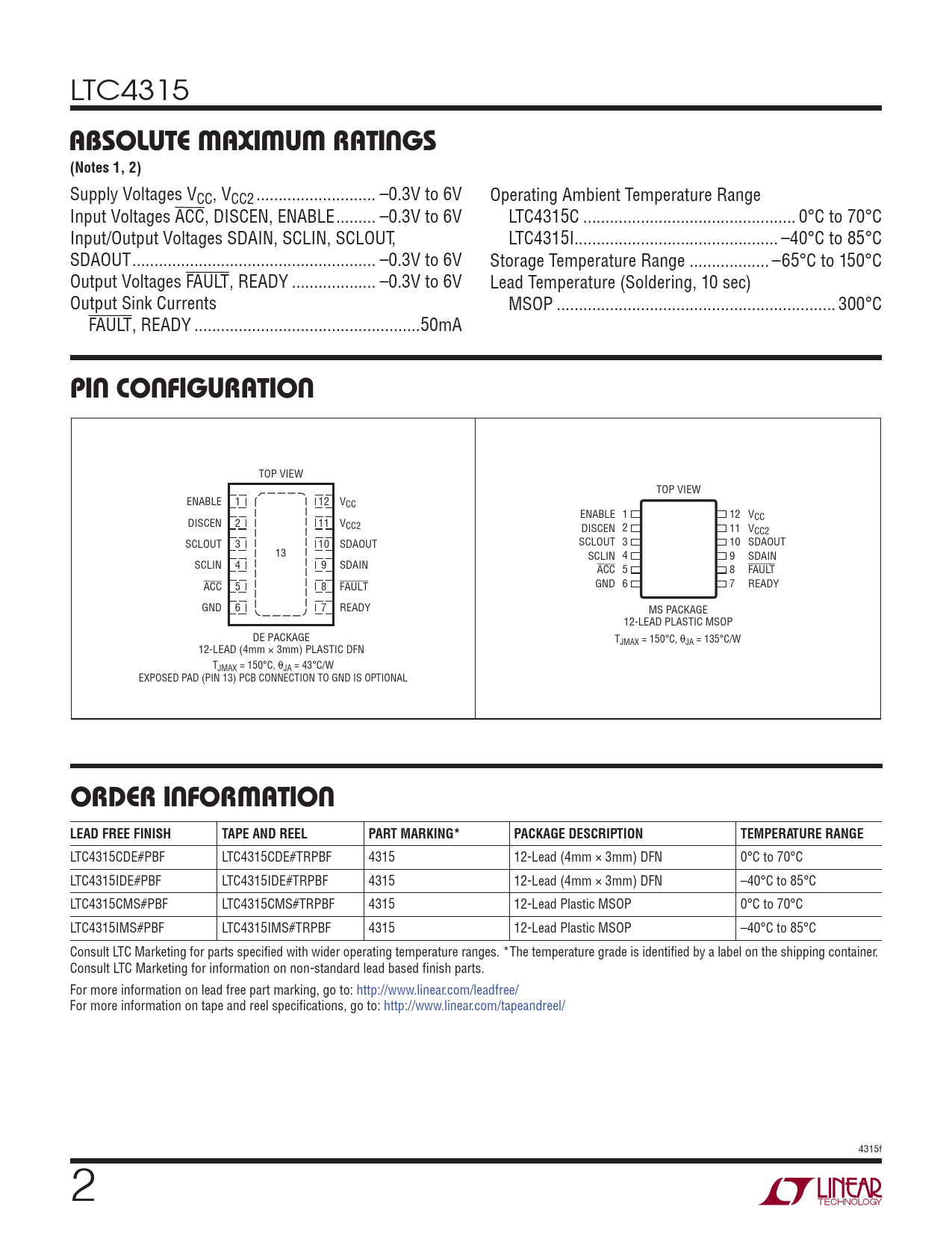 Supply Voltages VCC, VCC2 ... –0.3V to 6V Operating Ambient Temperature Range Input Voltages ACC, DISCEN, ENABLE ... –0.3V to 6V LTC4315C .. 0°C to 70°C Input/Output Voltages SDAIN, SCLIN, SCLOUT, LTC4315I.. –40°C to 85°C SDAOUT ... –0.3V to 6V Storage Temperature Range .. –65°C to 150°C Output Voltages FAULT, READY ... –0.3V to 6V Lead Temperature (Soldering, 10 sec) Output Sink Currents MSOP ... 300°C FAULT, READY ...50mA