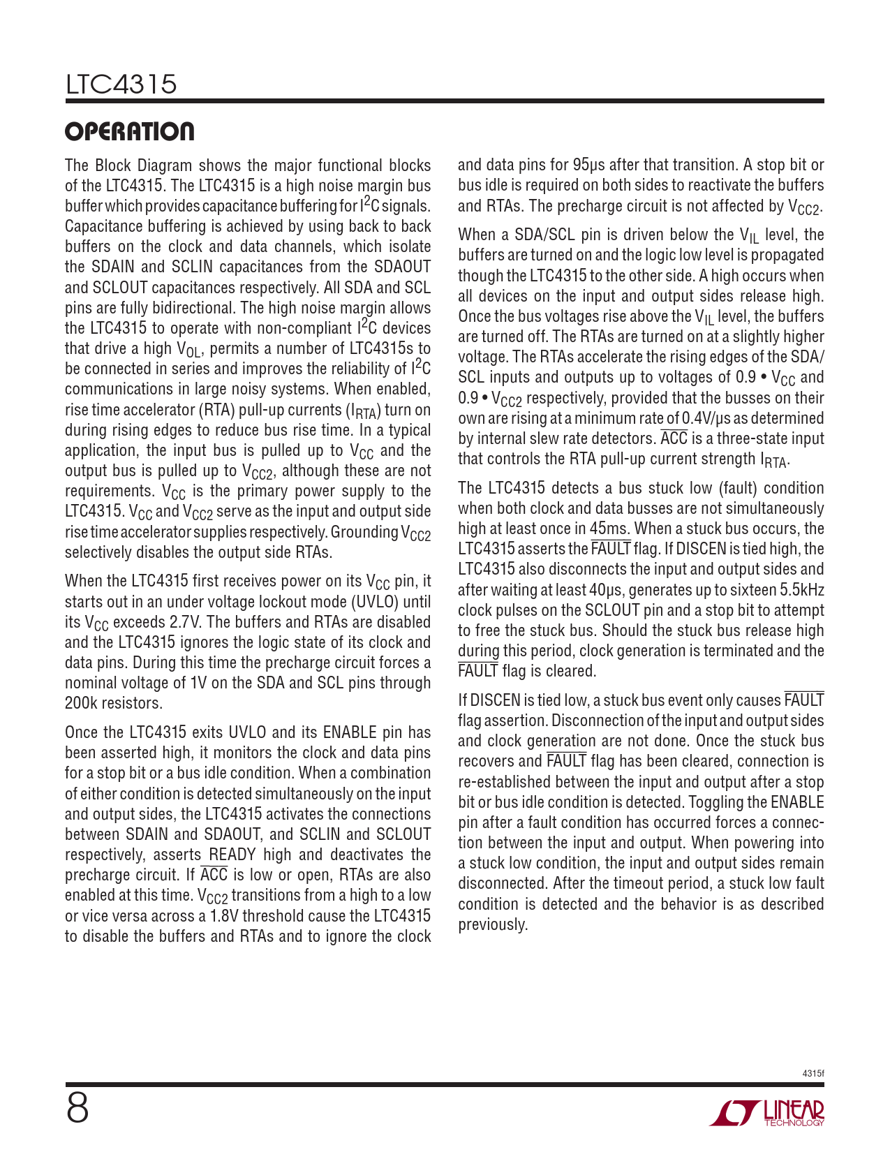 LTC4315 OPERATION The Block Diagram shows the major functional blocks and data pins for 95μs after that transition. A stop bit or of the LTC4315. The LTC4315 is a high noise margin bus bus idle is required on both sides to reactivate the buffers buffer which provides capacitance buffering for I2C signals. and RTAs. The precharge circuit is not affected by VCC2. Capacitance buffering is achieved by using back to back When a SDA/SCL pin is driven below the V buffers on the clock and data channels, which isolate IL level, the buffers are turned on and the logic low level is propagated the SDAIN and SCLIN capacitances from the SDAOUT though the LTC4315 to the other side. A high occurs when and SCLOUT capacitances respectively. All SDA and SCL all devices on the input and output sides release high. pins are fully bidirectional. The high noise margin allows Once the bus voltages rise above the V the LTC4315 to operate with non-compliant I2C devices IL level, the buffers are turned off. The RTAs are turned on at a slightly higher that drive a high VOL, permits a number of LTC4315s to voltage. The RTAs accelerate the rising edges of the SDA/ be connected in series and improves the reliability of I2C SCL inputs and outputs up to voltages of 0.9 • V communications in large noisy systems. When enabled, CC and 0.9 • V rise time accelerator (RTA) pull-up currents (I CC2 respectively, provided that the busses on their RTA) turn on own are rising at a minimum rate of 0.4V/μs as determined during rising edges to reduce bus rise time. In a typical by internal slew rate detectors. ACC is a three-state input application, the input bus is pulled up to VCC and the that controls the RTA pull-up current strength I output bus is pulled up to V RTA. CC2, although these are not requirements. V The LTC4315 detects a bus stuck low (fault) condition CC is the primary power supply to the LTC4315. V when both clock and data busses are not simultaneously CC and VCC2 serve as the input and output side rise time accelerator supplies respectively. Grounding V high at least once in 45ms. When a stuck bus occurs, the CC2 selectively disables the output side RTAs. LTC4315 asserts the FAULT flag. If DISCEN is tied high, the LTC4315 also disconnects the input and output sides and When the LTC4315 first receives power on its VCC pin, it after waiting at least 40μs, generates up to sixteen 5.5kHz starts out in an under voltage lockout mode (UVLO) until clock pulses on the SCLOUT pin and a stop bit to attempt its VCC exceeds 2.7V. The buffers and RTAs are disabled to free the stuck bus. Should the stuck bus release high and the LTC4315 ignores the logic state of its clock and during this period, clock generation is terminated and the data pins. During this time the precharge circuit forces a FAULT flag is cleared. nominal voltage of 1V on the SDA and SCL pins through 200k resistors. If DISCEN is tied low, a stuck bus event only causes FAULT flag assertion. Disconnection of the input and output sides Once the LTC4315 exits UVLO and its ENABLE pin has and clock generation are not done. Once the stuck bus been asserted high, it monitors the clock and data pins recovers and FAULT flag has been cleared, connection is for a stop bit or a bus idle condition. When a combination re-established between the input and output after a stop of either condition is detected simultaneously on the input bit or bus idle condition is detected. Toggling the ENABLE and output sides, the LTC4315 activates the connections pin after a fault condition has occurred forces a connec- between SDAIN and SDAOUT, and SCLIN and SCLOUT tion between the input and output. When powering into respectively, asserts READY high and deactivates the a stuck low condition, the input and output sides remain precharge circuit. If ACC is low or open, RTAs are also disconnected. After the timeout period, a stuck low fault enabled at this time. VCC2 transitions from a high to a low condition is detected and the behavior is as described or vice versa across a 1.8V threshold cause the LTC4315 previously. to disable the buffers and RTAs and to ignore the clock 4315f 8 Document Outline FEATURES DESCRIPTION APPLICATIONS TYPICAL APPLICATION ABSOLUTE MAXIMUM RATINGS PIN CONFIGURATION ORDER INFORMATION ELECTRICAL CHARACTERISTICS TYPICAL PERFORMANCE CHARACTERISTICS PIN FUNCTIONS BLOCK DIAGRAM OPERATION APPLICATIONS INFORMATION PACKAGE DESCRIPTION TYPICAL APPLICATION RELATED PARTS