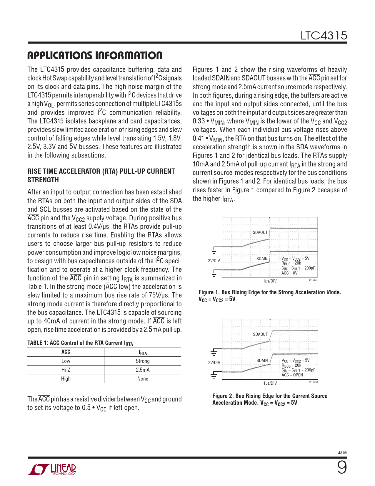 strong mode current is therefore directly proportional to the bus capacitance. The LTC4315 is capable of sourcing up to 40mA of current in the strong mode. If ACC is left open, rise time acceleration is provided by a 2.5mA pull up. SDAOUT