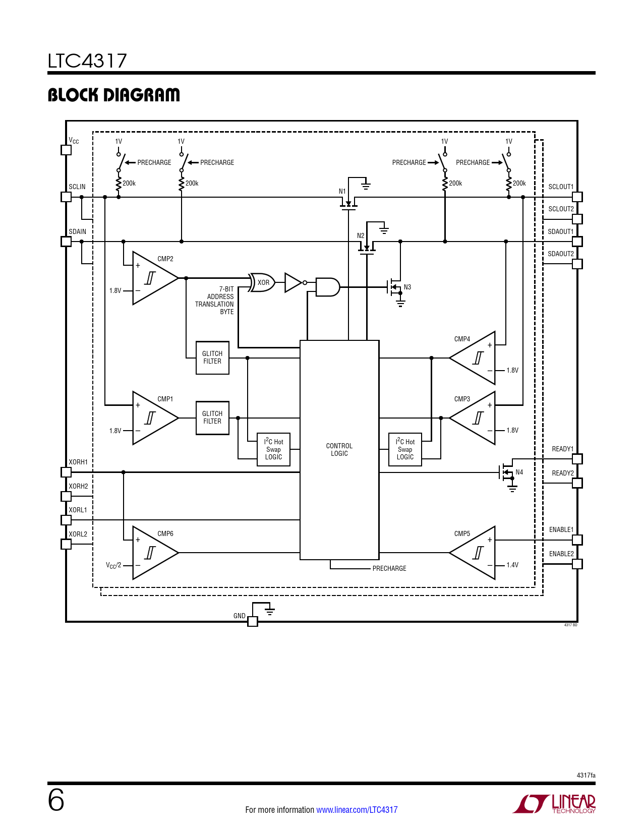 VCC 1V 1V 1V 1V PRECHARGE PRECHARGE PRECHARGE PRECHARGE 200k SCLIN 200k 200k 200k SCLOUT1 N1 SCLOUT2 SDAIN SDAOUT1 N2 SDAOUT2 CMP2 + XOR 7-BIT N3 1.8V – ADDRESS TRANSLATION BYTE CMP4 + GLITCH FILTER – 1.8V CMP1 CMP3 + + GLITCH FILTER 1.8V – – 1.8V I2C Hot I2C Hot Swap CONTROL Swap READY1 LOGIC LOGIC LOGIC XORH1 N4 READY2 XORH2 XORL1 XORL2 CMP6 CMP5 ENABLE1 + + ENABLE2 VCC/2 – PRECHARGE – 1.4V GND 4317 BD 4317fa 6 For more information www.linear.com/LTC4317 Document Outline Features Applications Typical Application Description Absolute Maximum Ratings Order Information Pin Configuration Electrical Characteristics Timing Diagram Typical Performance Characteristics Pin Functions Block Diagram Operation Typical Applications Package Description Revision History Typical Application Related Parts