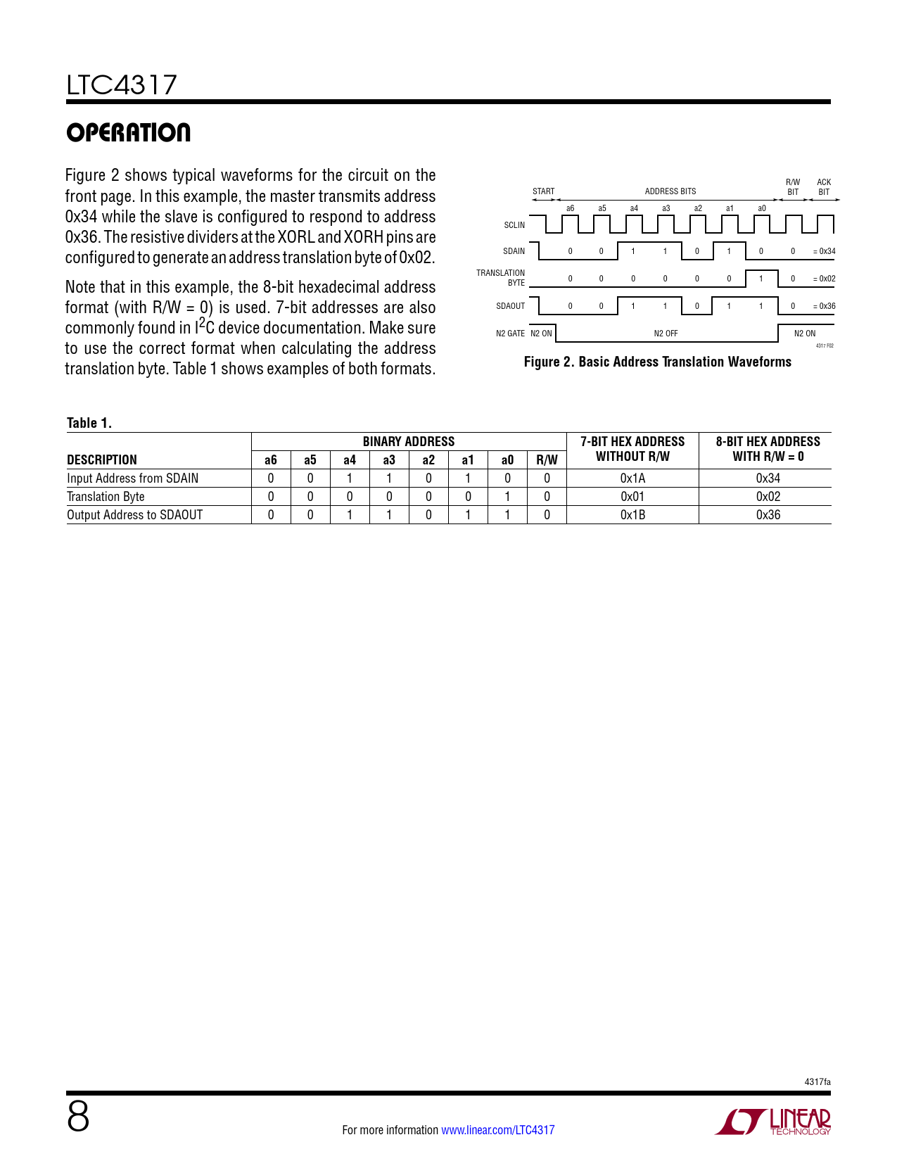 Figure 2 shows typical waveforms for the circuit on the R/W ACK START ADDRESS BITS BIT BIT front page. In this example, the master transmits address a6 a5 a4 a3 a2 a1 a0 0x34 while the slave is configured to respond to address SCLIN 0x36. The resistive dividers at the XORL and XORH pins are SDAIN 0 0 1 1 0 1 0 0 = 0x34 configured to generate an address translation byte of 0x02. TRANSLATION BYTE 0 0 0 0 0 0 1 0 = 0x02 Note that in this example, the 8-bit hexadecimal address SDAOUT 0 0 1 1 0 1 1 0 = 0x36 format (with R/W = 0) is used. 7-bit addresses are also commonly found in I2C device documentation. Make sure N2 GATE N2 ON N2 OFF N2 ON 4317 F02 to use the correct format when calculating the address