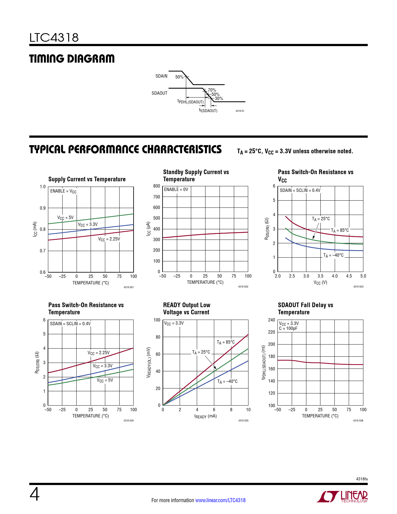 1.0 800 6 ENABLE = V ENABLE = 0V CC SDAIN = SCLIN = 0.4V 700 5 0.9 600 V 4 CC = 5V 500 TA = 25°C VCC = 3.3V (Ω) (mA) 0.8 (μA) 400 3 TA = 85°C I CC I CC VCC = 2.25V 300 R DS(ON) 2 0.7 200 1 TA = –40°C 100 0.6 0 0 –50 –25 0 25 50 75 100 –50 –25 0 25 50 75 100 2.0 2.5 3.0 3.5 4.0 4.5 5.0 TEMPERATURE (°C) TEMPERATURE (°C) VCC (V) 4318 G01 4318 G02 4318 G03