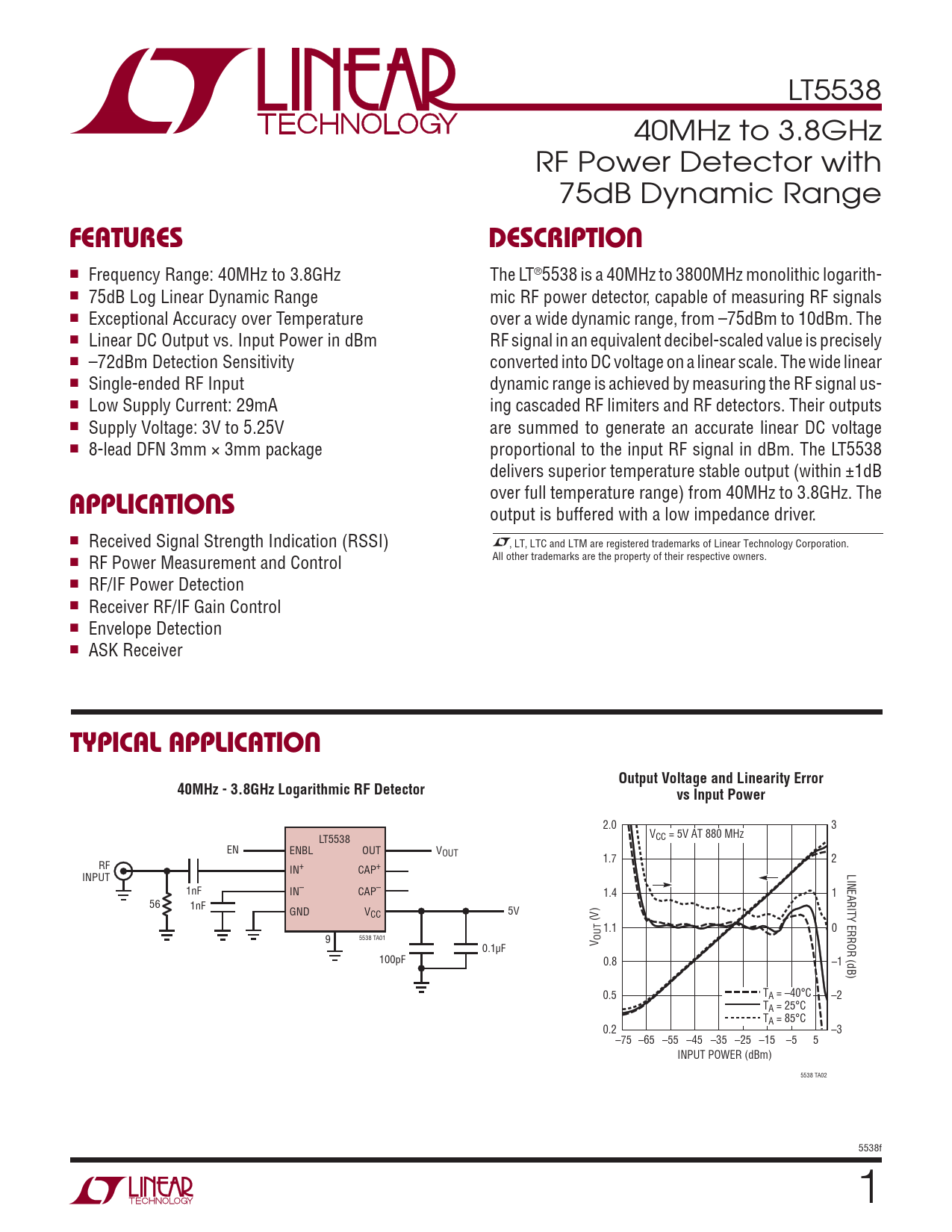 LT5538 40MHz to 3.8GHz RF Power Detector with 75dB Dynamic Range FEATURESDESCRIPTION ■ Frequency Range: 40MHz to 3.8GHz The LT®5538 is a 40MHz to 3800MHz monolithic logarith- ■ 75dB Log Linear Dynamic Range mic RF power detector, capable of measuring RF signals ■ Exceptional Accuracy over Temperature over a wide dynamic range, from –75dBm to 10dBm. The ■ Linear DC Output vs. Input Power in dBm RF signal in an equivalent decibel-scaled value is precisely ■ –72dBm Detection Sensitivity converted into DC voltage on a linear scale. The wide linear ■ Single-ended RF Input dynamic range is achieved by measuring the RF signal us- ■ Low Supply Current: 29mA ing cascaded RF limiters and RF detectors. Their outputs ■ Supply Voltage: 3V to 5.25V are summed to generate an accurate linear DC voltage ■ 8-lead DFN 3mm × 3mm package proportional to the input RF signal in dBm. The LT5538 delivers superior temperature stable output (within ±1dB APPLICATIONS over full temperature range) from 40MHz to 3.8GHz. The output is buffered with a low impedance driver. ■ Received Signal Strength Indication (RSSI) , LT, LTC and LTM are registered trademarks of Linear Technology Corporation. ■ RF Power Measurement and Control All other trademarks are the property of their respective owners. ■ RF/IF Power Detection ■ Receiver RF/IF Gain Control ■ Envelope Detection ■ ASK Receiver TYPICAL APPLICATIONOutput Voltage and Linearity Error40MHz - 3.8GHz Logarithmic RF Detectorvs Input Power 2.0 3 V LT5538 CC = 5V AT 880 MHz EN ENBL OUT VOUT 1.7 2 RF IN+ CAP+ LINEARITY ERROR (dB) INPUT 1nF IN– CAP– 1.4 1 56 1nF GND V 5V CC (V) 1.1 0 5538 TA01 9 OUTV 0.1μF 100pF 0.8 –1 0.5 TA = –40°C –2 TA = 25°C TA = 85°C 0.2 –3 –75 –65 –55 –45 –35 –25 –15 –5 5 INPUT POWER (dBm) 5538 TA02 5538f 1