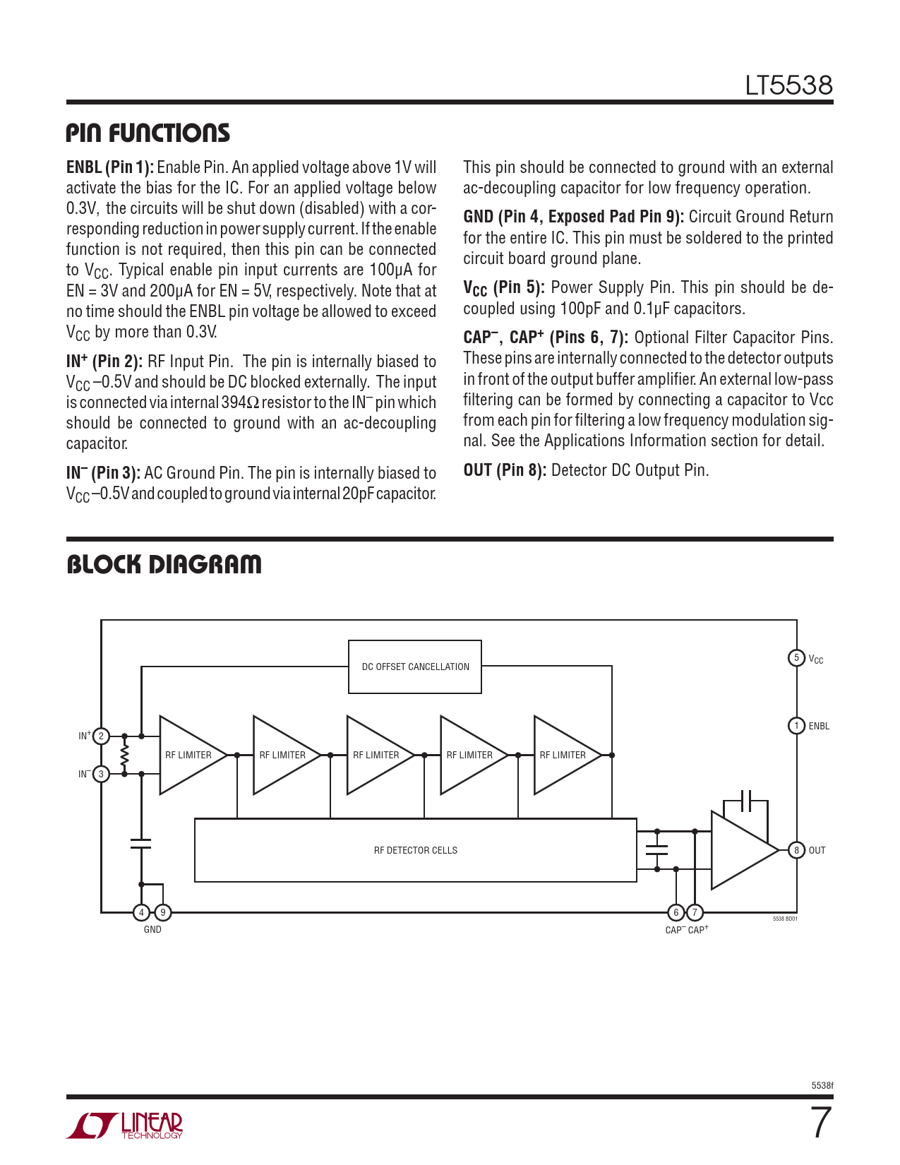 5 VCC DC OFFSET CANCELLATION 1 ENBL IN+ 2 RF LIMITER RF LIMITER RF LIMITER RF LIMITER RF LIMITER IN– 3 RF DETECTOR CELLS 8 OUT 4 9 6 7 5538 BD01 GND CAP– CAP+ 5538f 7