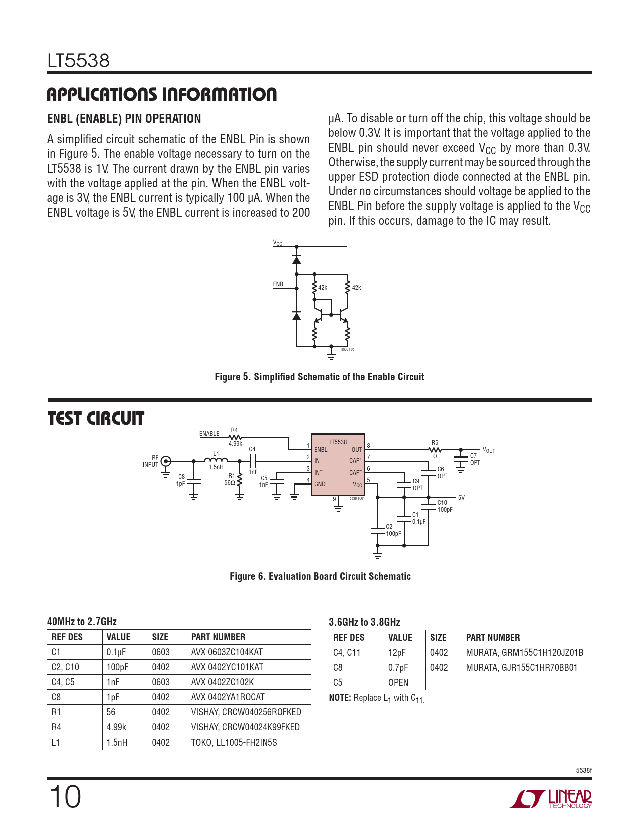 LT5538 APPLICATIONS INFORMATIONENBL (ENABLE) PIN OPERATION μA. To disable or turn off the chip, this voltage should be below 0.3V. It is important that the voltage applied to the A simplifi ed circuit schematic of the ENBL Pin is shown ENBL pin should never exceed V in Figure 5. The enable voltage necessary to turn on the CC by more than 0.3V. Otherwise, the supply current may be sourced through the LT5538 is 1V. The current drawn by the ENBL pin varies upper ESD protection diode connected at the ENBL pin. with the voltage applied at the pin. When the ENBL volt- Under no circumstances should voltage be applied to the age is 3V, the ENBL current is typically 100 μA. When the ENBL Pin before the supply voltage is applied to the V ENBL voltage is 5V, the ENBL current is increased to 200 CC pin. If this occurs, damage to the IC may result. VCC ENBL 42k 42k 5538 F05 Figure 5. Simplifi ed Schematic of the Enable CircuitTEST CIRCUIT R4 ENABLE 4.99k LT5538 R5 1 8 C4 ENBL OUT V L1 OUT RF 2 7 O C7 IN+ CAP+ INPUT OPT 1.5nH 3 6 C6 1nF IN– CAP– C8 R1 C5 OPT 4 5 C9 1pF 56Ω 1nF GND VCC OPT 5538 TC01 5V 9 C10 100pF C1 0.1μF C2 100pF Figure 6. Evaluation Board Circuit Schematic40MHz to 2.7GHz3.6GHz to 3.8GHzREF DESVALUESIZEPART NUMBERREF DESVALUESIZEPART NUMBER C1 0.1μF 0603 AVX 0603ZC104KAT C4, C11 12pF 0402 MURATA, GRM155C1H120JZ01B C2, C10 100pF 0402 AVX 0402YC101KAT C8 0.7pF 0402 MURATA, GJR155C1HR70BB01 C4, C5 1nF 0603 AVX 0402ZC102K C5 OPEN C8 1pF 0402 AVX 0402YA1ROCAT NOTE: Replace L1 with C11. R1 56 0402 VISHAY, CRCW040256ROFKED R4 4.99k 0402 VISHAY, CRCW04024K99FKED L1 1.5nH 0402 TOKO, LL1005-FH2IN5S 5538f 10