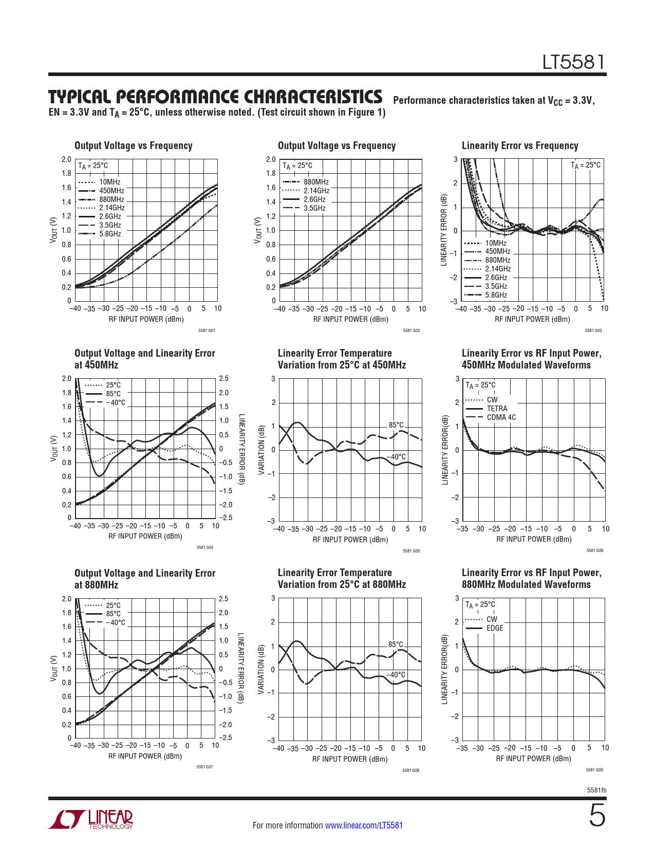 2.0 2.5 3 3 25°C TA = 25°C 1.8 85°C 2.0 CW 1.6 –40°C 1.5 2 2 LINEARITY ERROR (dB) TETRA 1.4 1.0 CDMA 4C 1 85°C 1 1.2 0.5 (V) 1.0 0 0 0 V OUT –40°C 0.8 –0.5 VARIATION (dB) 0.6 –1.0 –1 –1 LINEARITY ERROR(dB) 0.4 –1.5 –2 –2 0.2 –2.0 0 –2.5 –3 –3 –40 –35 –30 –25 –20 –15 –10 –5 0 5 10 –40 –35 –30 –25 –20 –15 –10 –5 0 5 10 –35 –30 –25 –20 –15 –10 –5 0 5 10 RF INPUT POWER (dBm) RF INPUT POWER (dBm) RF INPUT POWER (dBm) 5581 G04 5581 G05 5581 G06