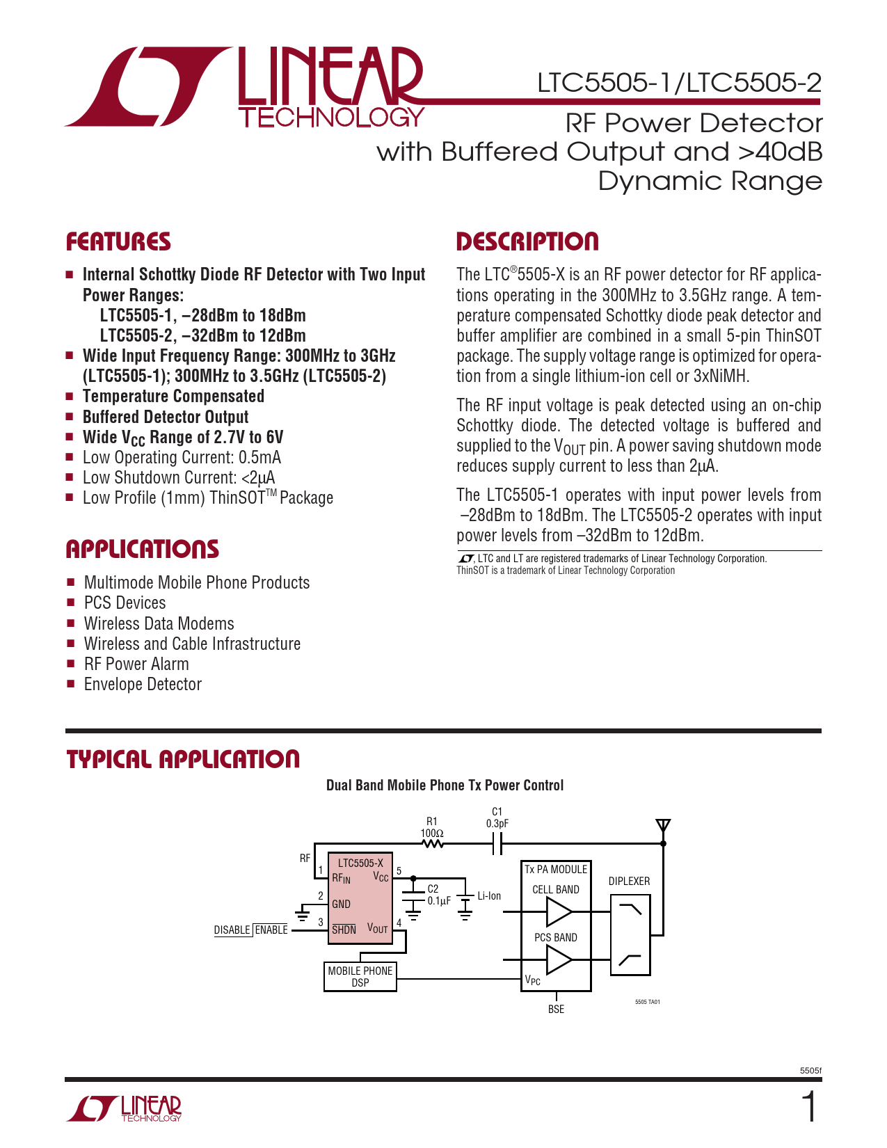 , LTC and LT are registered trademarks of Linear Technology Corporation. ThinSOT is a trademark of Linear Technology Corporation ■ Multimode Mobile Phone Products ■ PCS Devices ■ Wireless Data Modems ■ Wireless and Cable Infrastructure ■ RF Power Alarm ■ Envelope Detector