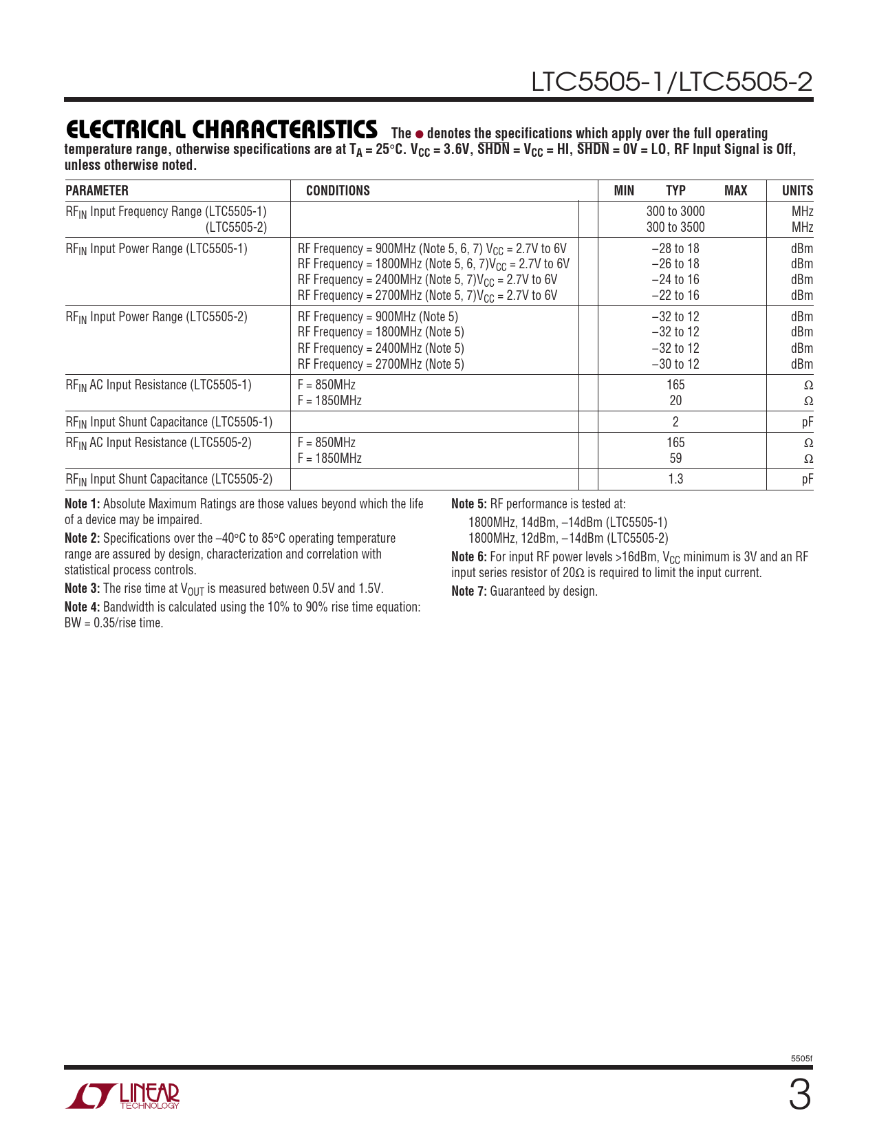 RFIN Input Frequency Range (LTC5505-1) 300 to 3000 MHz (LTC5505-2) 300 to 3500 MHz RFIN Input Power Range (LTC5505-1) RF Frequency = 900MHz (Note 5, 6, 7) VCC = 2.7V to 6V –28 to 18 dBm RF Frequency = 1800MHz (Note 5, 6, 7)VCC = 2.7V to 6V –26 to 18 dBm RF Frequency = 2400MHz (Note 5, 7)VCC = 2.7V to 6V –24 to 16 dBm RF Frequency = 2700MHz (Note 5, 7)VCC = 2.7V to 6V –22 to 16 dBm RFIN Input Power Range (LTC5505-2) RF Frequency = 900MHz (Note 5) –32 to 12 dBm RF Frequency = 1800MHz (Note 5) –32 to 12 dBm RF Frequency = 2400MHz (Note 5) –32 to 12 dBm RF Frequency = 2700MHz (Note 5) –30 to 12 dBm RFIN AC Input Resistance (LTC5505-1) F = 850MHz 165 Ω F = 1850MHz 20 Ω RFIN Input Shunt Capacitance (LTC5505-1) 2 pF RFIN AC Input Resistance (LTC5505-2) F = 850MHz 165 Ω F = 1850MHz 59 Ω RFIN Input Shunt Capacitance (LTC5505-2) 1.3 pF