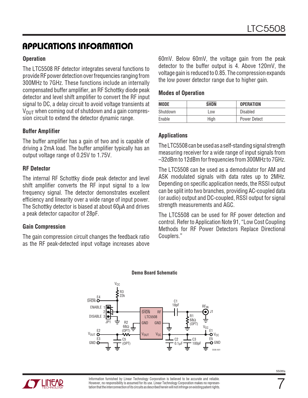 LTC5508 UUWUAPPLICATIO S I FOR ATIOOperation 60mV. Below 60mV, the voltage gain from the peak detector to the buffer output is 4. Above 120mV, the The LTC5508 RF detector integrates several functions to voltage gain is reduced to 0.85. The compression expands provide RF power detection over frequencies ranging from the low power detector range due to higher gain. 300MHz to 7GHz. These functions include an internally compensated buffer amplifier, an RF Schottky diode peak Modes of Operation detector and level shift amplifier to convert the RF input signal to DC, a delay circuit to avoid voltage transients at MODESHDNOPERATION VOUT when coming out of shutdown and a gain compres- Shutdown Low Disabled sion circuit to extend the detector dynamic range. Enable High Power Detect Buffer AmplifierApplications The buffer amplifier has a gain of two and is capable of driving a 2mA load. The buffer amplifier typically has an The LTC5508 can be used as a self-standing signal strength output voltage range of 0.25V to 1.75V. measuring receiver for a wide range of input signals from –32dBm to 12dBm for frequencies from 300MHz to 7GHz. RF Detector The LTC5508 can be used as a demodulator for AM and The internal RF Schottky diode peak detector and level ASK modulated signals with data rates up to 2MHz. shift amplifier converts the RF input signal to a low Depending on specific application needs, the RSSI output frequency signal. The detector demonstrates excellent can be split into two branches, providing AC-coupled data efficiency and linearity over a wide range of input power. (or audio) output and DC-coupled, RSSI output for signal The Schottky detector is biased at about 60µA and drives strength measurements and AGC. a peak detector capacitor of 28pF. The LTC5508 can be used for RF power detection and control. Refer to Application Note 91, “Low Cost Coupling Gain Compression Methods for RF Power Detectors Replace Directional The gain compression circuit changes the feedback ratio Couplers.” as the RF peak-detected input voltage increases above Demo Board Schematic VCC R3 E4 22k SHDN C1 18pF ENABLE 1 RFIN 2 SHDN RF J1 DISABLE 3 LTC5508 R1 68Ω JP1 R2 GND GND (OPT) 68Ω VCC E2 (OPT) E1 VOUT VOUT VCC VCC E3 C5 C2 C3 E5 GND (OPT) 0.1µF 100pF GND 5508 AI01 5508fa Information furnished by Linear Technology Corporation is believed to be accurate and reliable. However, no responsibility is assumed for its use. Linear Technology Corporation makes no represen- tation that the interconnection of its circuits as described herein will not infringe on existing patent rights. 7