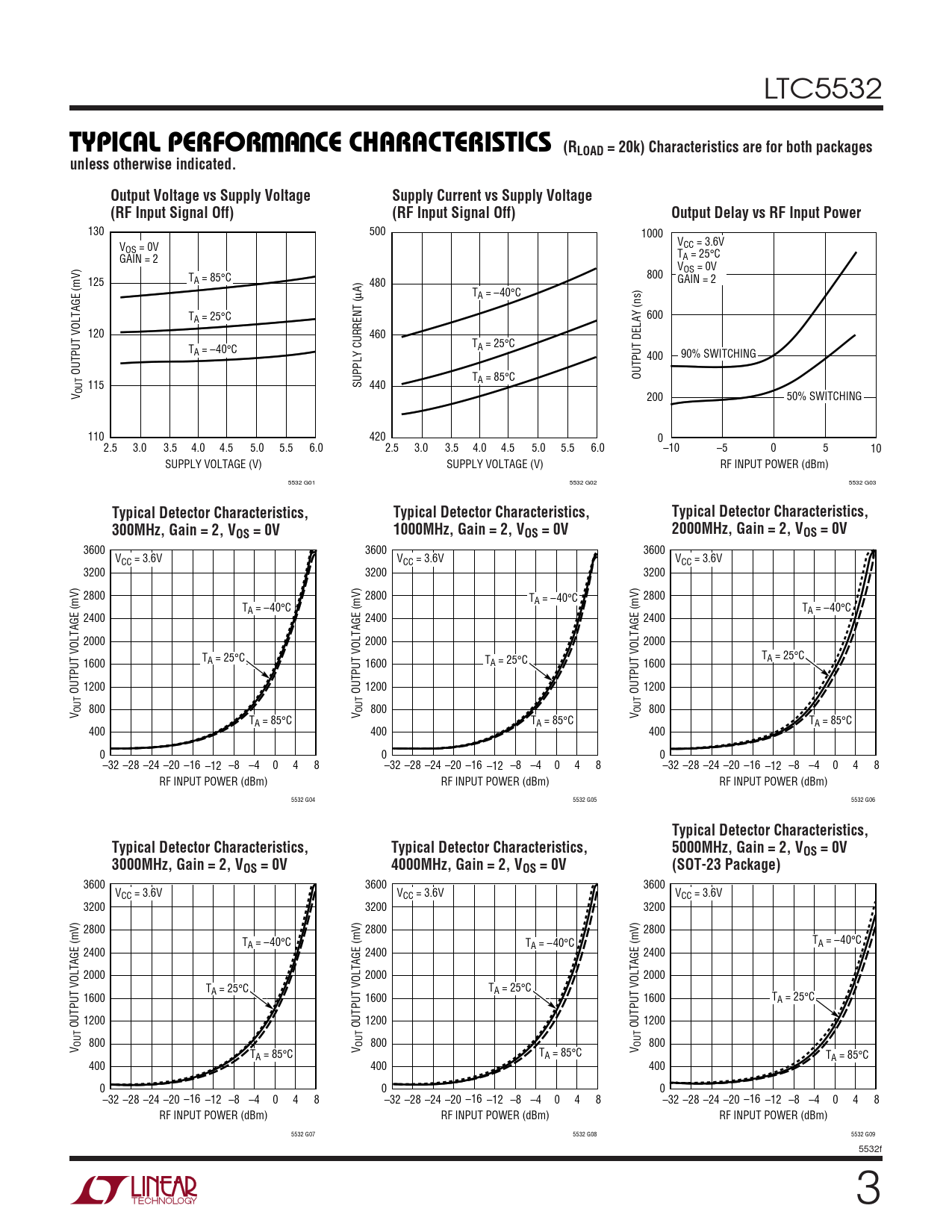 3600 3600 3600 VCC = 3.6V VCC = 3.6V VCC = 3.6V 3200 3200 3200 2800 2800 2800 TA = –40°C T T A = –40°C A = –40°C 2400 2400 2400 2000 2000 2000 TA = 25°C TA = 25°C 1600 1600 1600 TA = 25°C 1200 1200 1200 OUTPUT VOLTAGE (mV) OUTPUT VOLTAGE (mV) OUTPUT VOLTAGE (mV) OUT 800 OUT 800 OUT 800 V V V TA = 85°C TA = 85°C TA = 85°C 400 400 400 0 0 0 –32 –28 –24 –20 –16 –12 –8 –4 0 4 8 –32 –28 –24 –20 –16 –12 –8 –4 0 4 8 –32 –28 –24 –20 –16 –12 –8 –4 0 4 8 RF INPUT POWER (dBm) RF INPUT POWER (dBm) RF INPUT POWER (dBm) 5532 G07 5532 G08 5532 G09 5532f 3