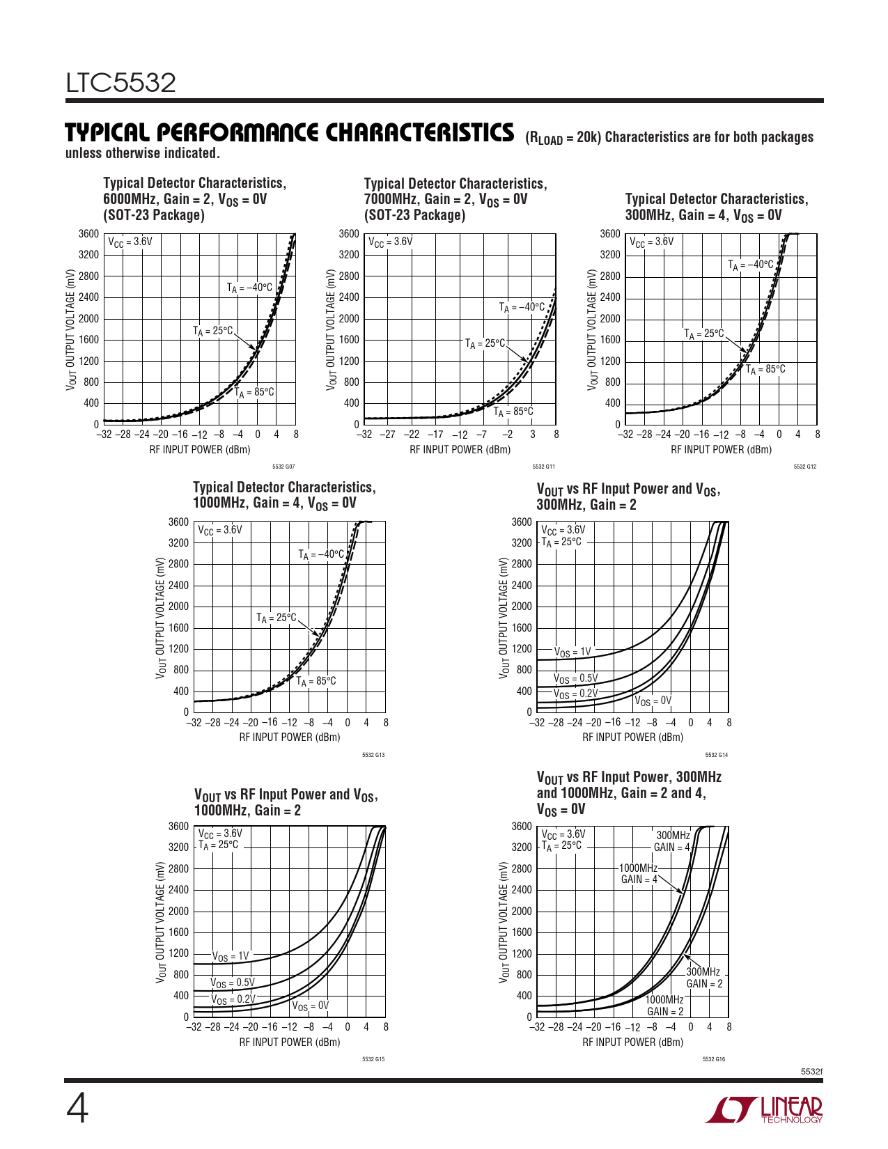 LTC5532 WUTYPICAL PERFOR A CE CHARACTERISTICS (RLOAD = 20k) Characteristics are for both packagesunless otherwise indicated.Typical Detector Characteristics,Typical Detector Characteristics,6000MHz, Gain = 2, VOS = 0V7000MHz, Gain = 2, VTypical Detector Characteristics,OS = 0V(SOT-23 Package)(SOT-23 Package)300MHz, Gain = 4, VOS = 0V 3600 3600 3600 VCC = 3.6V VCC = 3.6V VCC = 3.6V 3200 3200 3200 TA = –40°C 2800 2800 2800 TA = –40°C 2400 2400 2400 TA = –40°C 2000 2000 2000 TA = 25°C T 1600 1600 A = 25°C T 1600 A = 25°C 1200 1200 1200 OUTPUT VOLTAGE (mV) OUTPUT VOLTAGE (mV) OUTPUT VOLTAGE (mV) TA = 85°C OUT 800 OUT 800 OUT 800 V V V TA = 85°C 400 400 400 TA = 85°C 0 0 0 –32 –28 –24 –20 –16 –12 –8 –4 0 4 8 –32 –27 –22 –17 –12 –7 –2 3 8 –32 –28 –24 –20 –16 –12 –8 –4 0 4 8 RF INPUT POWER (dBm) RF INPUT POWER (dBm) RF INPUT POWER (dBm) 5532 G07 5532 G11 5532 G12 Typical Detector Characteristics,VOUT vs RF Input Power and VOS,1000MHz, Gain = 4, VOS = 0V300MHz, Gain = 2 3600 3600 VCC = 3.6V VCC = 3.6V 3200 3200 TA = 25°C TA = –40°C 2800 2800 2400 2400 2000 2000 TA = 25°C 1600 1600 1200 1200 OUTPUT VOLTAGE (mV) OUTPUT VOLTAGE (mV) VOS = 1V OUT 800 OUT 800 V V T V A = 85°C OS = 0.5V 400 400 VOS = 0.2V VOS = 0V 0 0 –32 –28 –24 –20 –16 –12 –8 –4 0 4 8 –32 –28 –24 –20 –16 –12 –8 –4 0 4 8 RF INPUT POWER (dBm) RF INPUT POWER (dBm) 5532 G13 5532 G14 VOUT vs RF Input Power, 300MHzVOUT vs RF Input Power and VOS,and 1000MHz, Gain = 2 and 4,1000MHz, Gain = 2VOS = 0V 3600 3600 VCC = 3.6V VCC = 3.6V 300MHz 3200 TA = 25°C 3200 TA = 25°C GAIN = 4 2800 2800 1000MHz GAIN = 4 2400 2400 2000 2000 1600 1600 1200 1200 OUTPUT VOLTAGE (mV) VOS = 1V OUTPUT VOLTAGE (mV) OUT 800 OUT 800 300MHz V V V OS = 0.5V GAIN = 2 400 V 400 OS = 0.2V 1000MHz VOS = 0V GAIN = 2 0 0 –32 –28 –24 –20 –16 –12 –8 –4 0 4 8 –32 –28 –24 –20 –16 –12 –8 –4 0 4 8 RF INPUT POWER (dBm) RF INPUT POWER (dBm) 5532 G15 5532 G16 5532f 4