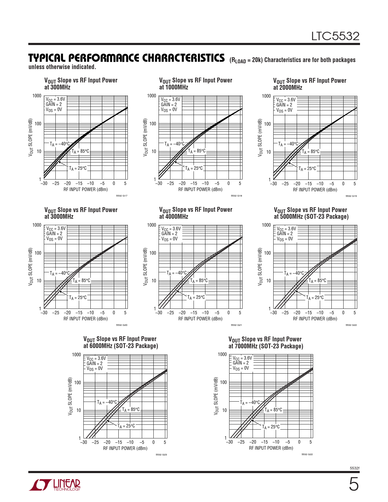 1000 1000 1000 VCC = 3.6V VCC = 3.6V VCC = 3.6V GAIN = 2 GAIN = 2 GAIN = 2 VOS = 0V VOS = 0V VOS = 0V 100 100 100 SLOPE (mV/dB) TA = –40°C SLOPE (mV/dB) TA = –40°C T SLOPE (mV/dB) A = –40°C OUT 10 TA = 85°C OUT 10 TA = 85°C 10 TA = 85°C V V OUTV TA = 25°C TA = 25°C TA = 25°C 1 1 1 –30 –25 –20 –15 –10 –5 0 5 –30 –25 –20 –15 –10 –5 0 5 –30 –25 –20 –15 –10 –5 0 5 RF INPUT POWER (dBm) RF INPUT POWER (dBm) RF INPUT POWER (dBm) 5532 G17 5532 G18 5532 G19