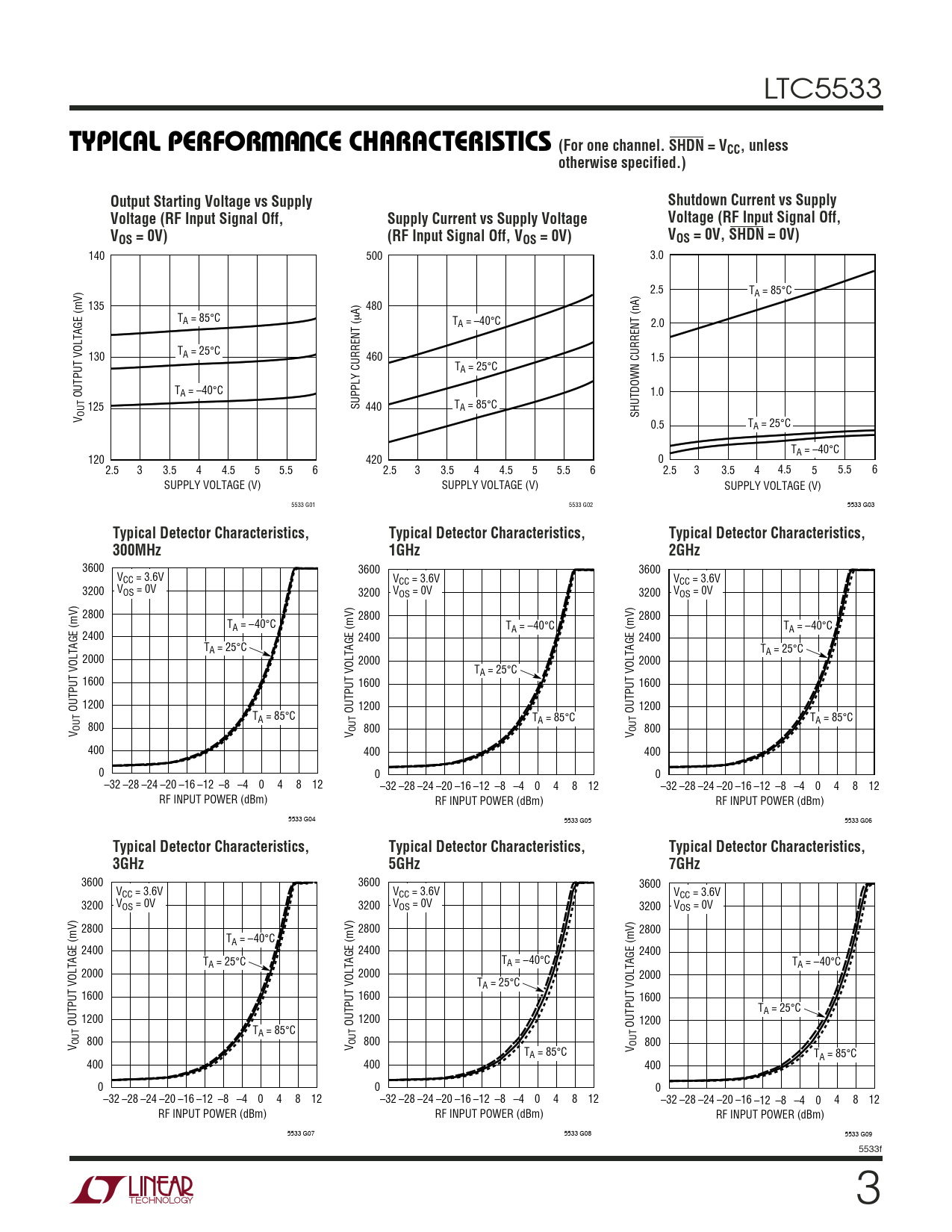 3600 3600 3600 VCC = 3.6V VCC = 3.6V VCC = 3.6V 3200 VOS = 0V 3200 VOS = 0V 3200 VOS = 0V 2800 2800 2800 TA = –40°C 2400 2400 2400 TA = 25°C TA = –40°C TA = –40°C 2000 2000 2000 TA = 25°C 1600 1600 1600 TA = 25°C 1200 1200 OUTPUT VOLTAGE (mV) OUTPUT VOLTAGE (mV) 1200 T OUTPUT VOLTAGE (mV) A = 85°C OUT 800 OUT 800 V V OUT 800 T V A = 85°C TA = 85°C 400 400 400 0 0 0 –32 –28 –24 –20 –16 –12 –8 –4 0 4 8 12 –32 –28 –24 –20 –16 –12 –8 –4 0 4 8 12 –32 –28 –24 –20 –16 –12 –8 –4 0 4 8 12 RF INPUT POWER (dBm) RF INPUT POWER (dBm) RF INPUT POWER (dBm) 5533 G07 5533 G08 5533 G09 5533f 3