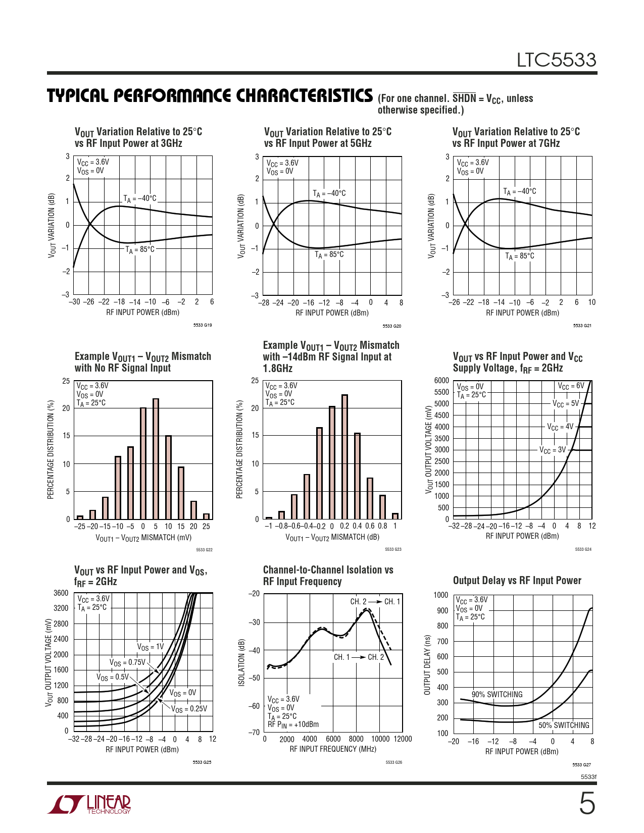 3600 –20 V 1000 CC = 3.6V CH. 2 CH. 1 VCC = 3.6V 3200 TA = 25°C 900 VOS = 0V TA = 25°C 2800 –30 800 2400 700 VOS = 1V –40 2000 CH. 1 CH. 2 600 VOS = 0.75V 1600 500 VOS = 0.5V –50 1200 ISOLATION (dB) OUTPUT VOLTAGE (mV) 400 VOS = 0V OUTPUT DELAY (ns) 90% SWITCHING OUT 800 V V CC = 3.6V 300 V –60 OS = 0.25V VOS = 0V 400 TA = 25°C 200 RF PIN = +10dBm 50% SWITCHING 0 –70 100 –32 –28 –24 –20 –16 –12 –8 –4 0 4 8 12 0 2000 4000 6000 8000 10000 12000 –20 –16 –12 –8 –4 0 4 8 RF INPUT POWER (dBm) RF INPUT FREQUENCY (MHz) RF INPUT POWER (dBm) 5533 G25 5533 G26 5533 G27 5533f 5