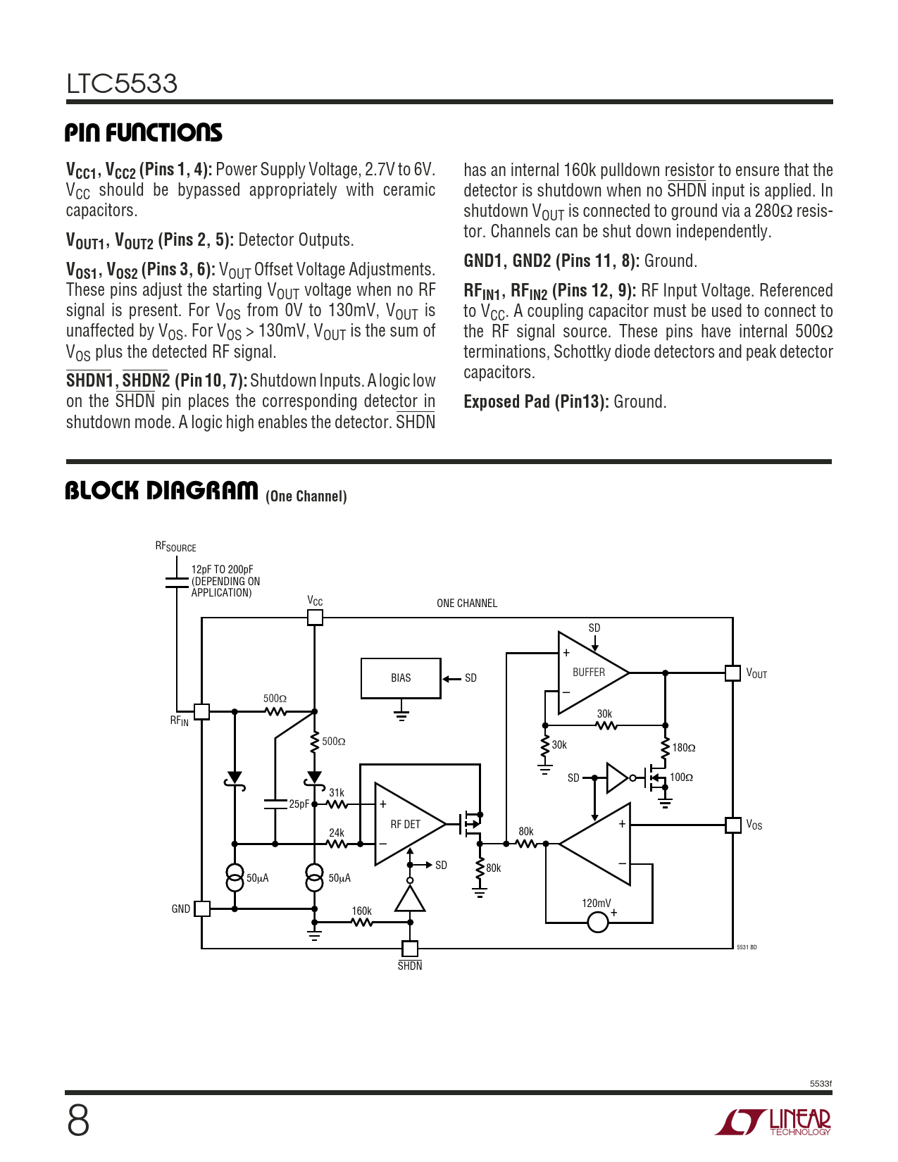 RFSOURCE 12pF TO 200pF (DEPENDING ON APPLICATION) VCC ONE CHANNEL SD + BUFFER VOUT BIAS SD – 500Ω 30k RFIN 500Ω 30k 180Ω SD 100Ω 31k 25pF + RF DET + VOS 24k 80k – SD – 80k 50µA 50µA 120mV GND 160k + 5531 BD SHDN 5533f 8