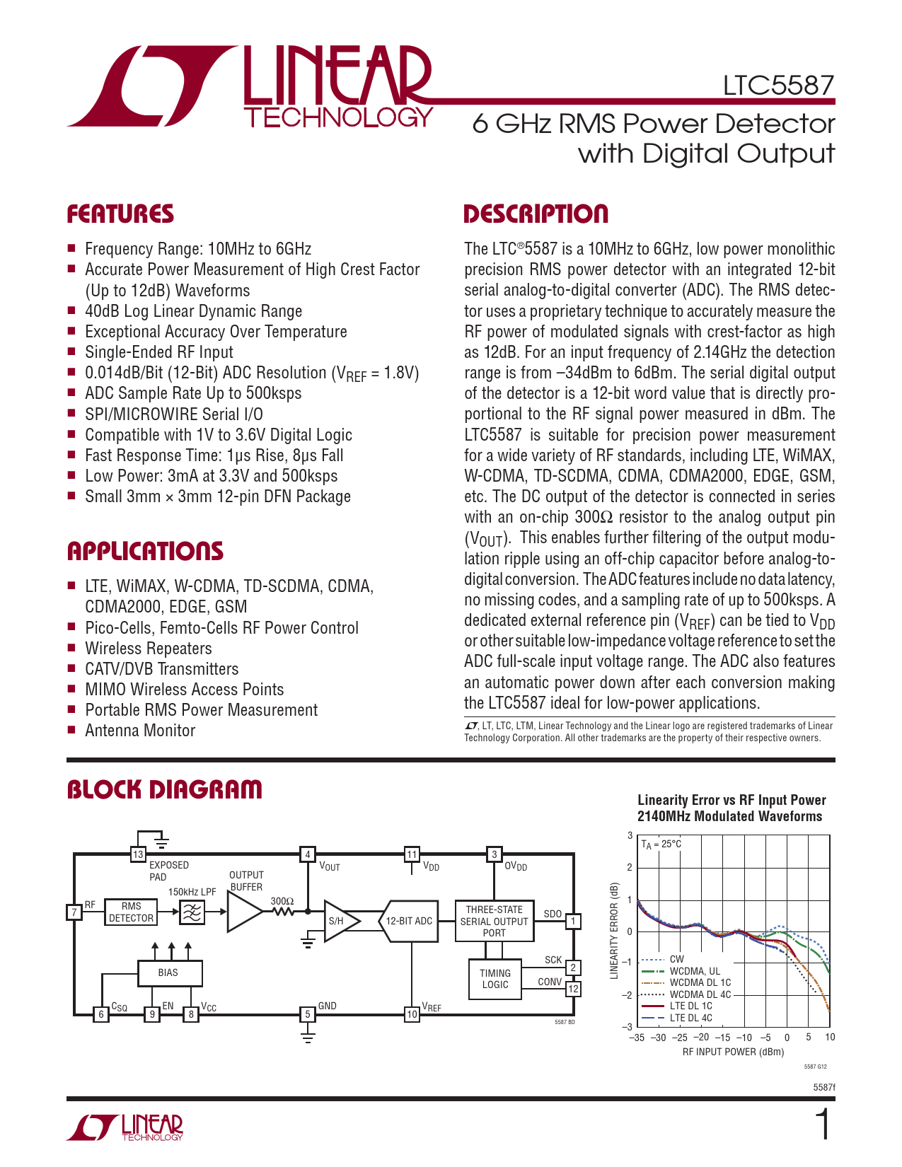LTC5587 6 GHz RMS Power Detector with Digital Output FEATURESDESCRIPTION n Frequency Range: 10MHz to 6GHz The LTC®5587 is a 10MHz to 6GHz, low power monolithic n Accurate Power Measurement of High Crest Factor precision RMS power detector with an integrated 12-bit (Up to 12dB) Waveforms serial analog-to-digital converter (ADC). The RMS detec- n 40dB Log Linear Dynamic Range tor uses a proprietary technique to accurately measure the n Exceptional Accuracy Over Temperature RF power of modulated signals with crest-factor as high n Single-Ended RF Input as 12dB. For an input frequency of 2.14GHz the detection n 0.014dB/Bit (12-Bit) ADC Resolution (V range is from –34dBm to 6dBm. The serial digital output REF = 1.8V) n ADC Sample Rate Up to 500ksps of the detector is a 12-bit word value that is directly pro- n SPI/MICROWIRE Serial I/O portional to the RF signal power measured in dBm. The n Compatible with 1V to 3.6V Digital Logic LTC5587 is suitable for precision power measurement n Fast Response Time: 1μs Rise, 8μs Fall for a wide variety of RF standards, including LTE, WiMAX, n Low Power: 3mA at 3.3V and 500ksps W-CDMA, TD-SCDMA, CDMA, CDMA2000, EDGE, GSM, n Small 3mm × 3mm 12-pin DFN Package etc. The DC output of the detector is connected in series with an on-chip 300Ω resistor to the analog output pin (VOUT). This enables further filtering of the output modu- APPLICATIONS lation ripple using an off-chip capacitor before analog-to- digital conversion. The ADC features include no data latency, n LTE, WiMAX, W-CDMA, TD-SCDMA, CDMA, no missing codes, and a sampling rate of up to 500ksps. A CDMA2000, EDGE, GSM dedicated external reference pin (V n REF) can be tied to VDD Pico-Cells, Femto-Cells RF Power Control or other suitable low-impedance voltage reference to set the n Wireless Repeaters ADC full-scale input voltage range. The ADC also features n CATV/DVB Transmitters an automatic power down after each conversion making n MIMO Wireless Access Points the LTC5587 ideal for low-power applications. n Portable RMS Power Measurement n Antenna Monitor L, LT, LTC, LTM, Linear Technology and the Linear logo are registered trademarks of Linear Technology Corporation. All other trademarks are the property of their respective owners. BLOCK DIAGRAMLinearity Error vs RF Input Power 2140MHz Modulated Waveforms 3 TA = 25°C 13 4 11 3 EXPOSED VOUT VDD OVDD 2 PAD OUTPUT BUFFER 150kHz LPF RF 300Ω 1 RMS 7 THREE-STATE SDO DETECTOR S/H 12-BIT ADC SERIAL OUTPUT 1 PORT 0 SCK –1 CW 2 BIAS TIMING WCDMA, UL LINEARITY ERROR (dB) CONV LOGIC WCDMA DL 1C 12 –2 WCDMA DL 4C C EN V GND V SQ CC REF LTE DL 1C 6 9 8 5 10 LTE DL 4C 5587 BD –3 –35 –30 –25 –20 –15 –10 –5 0 5 10 RF INPUT POWER (dBm) 5587 G12 5587f 1 Document Outline FEATURES DESCRIPTION APPLICATIONS BLOCK DIAGRAM ABSOLUTE MAXIMUM RATINGS PIN CONFIGURATION ORDER INFORMATION ELECTRICAL CHARACTERISTICS TYPICAL PERFORMANCE CHARACTERISTICS PIN FUNCTIONS BLOCK DIAGRAM TIMING DIAGRAMS TEST CIRCUIT APPLICATIONS INFORMATION PACKAGE DESCRIPTION TYPICAL APPLICATION RELATED PARTS