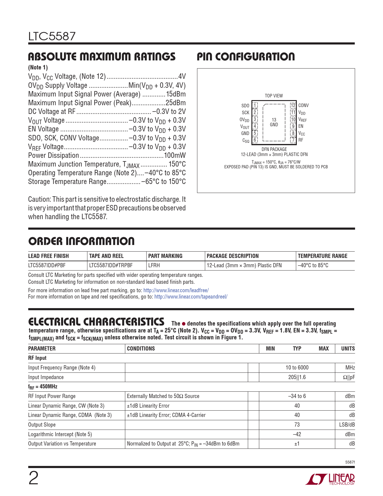 LTC5587 ABSOLUTE MAXIMUM RATINGSPIN CONFIGURATION(Note 1) VDD, VCC Voltage, (Note 12) ..4V OVDD Supply Voltage ..Min(VDD + 0.3V, 4V) Maximum Input Signal Power (Average) ...15dBm TOP VIEW Maximum Input Signal Power (Peak) ...25dBm SDO 1 12 CONV DC Voltage at RF .. –0.3V to 2V SCK 2 11 VDD OV 3 13 10 V DD REF VOUT Voltage ... –0.3V to VDD + 0.3V V 4 GND 9 EN OUT EN Voltage .. –0.3V to VDD + 0.3V GND 5 8 VCC SDO, SCK, CONV Voltage .. –0.3V to VDD + 0.3V C RF SQ 6 7 VREF Voltage .. –0.3V to VDD + 0.3V DFN PACKAGE 12-LEAD (3mm × 3mm) PLASTIC DFN Power Dissipation ...100mW TJMAX = 150°C, θJA = 76°C/W Maximum Junction Temperature, TJMAX ... 150°C EXPOSED PAD (PIN 13) IS GND, MUST BE SOLDERED TO PCB Operating Temperature Range (Note 2)..–40°C to 85°C Storage Temperature Range ... –65°C to 150°C Caution: This part is sensitive to electrostatic discharge. It is very important that proper ESD precautions be observed when handling the LTC5587. ORDER INFORMATIONLEAD FREE FINISHTAPE AND REELPART MARKINGPACKAGE DESCRIPTIONTEMPERATURE RANGE LTC5587IDD#PBF LTC5587IDD#TRPBF LFRH 12-Lead (3mm × 3mm) Plastic DFN –40°C to 85°C Consult LTC Marketing for parts specified with wider operating temperature ranges. Consult LTC Marketing for information on non-standard lead based finish parts. For more information on lead free part marking, go to: http://www.linear.com/leadfree/ For more information on tape and reel specifications, go to: http://www.linear.com/tapeandreel/ ELECTRICAL CHARACTERISTICSThe l denotes the specifications which apply over the full operatingtemperature range, otherwise specifications are at TA = 25°C (Note 2). VCC = VDD = OVDD = 3.3V, VREF = 1.8V, EN = 3.3V, fSMPL =fSMPL(MAX) and fSCK = fSCK(MAX) unless otherwise noted. Test circuit is shown in Figure 1.PARAMETERCONDITIONSMINTYPMAXUNITSRF Input Input Frequency Range (Note 4) 10 to 6000 MHz Input Impedance 205||1.6 Ω||pF fRF = 450MHz RF Input Power Range Externally Matched to 50Ω Source –34 to 6 dBm Linear Dynamic Range, CW (Note 3) ±1dB Linearity Error 40 dB Linear Dynamic Range, CDMA (Note 3) ±1dB Linearity Error; CDMA 4-Carrier 40 dB Output Slope 73 LSB/dB Logarithmic Intercept (Note 5) –42 dBm Output Variation vs Temperature Normalized to Output at 25°C; PIN = –34dBm to 6dBm ±1 dB 5587f 2 Document Outline FEATURES DESCRIPTION APPLICATIONS BLOCK DIAGRAM ABSOLUTE MAXIMUM RATINGS PIN CONFIGURATION ORDER INFORMATION ELECTRICAL CHARACTERISTICS TYPICAL PERFORMANCE CHARACTERISTICS PIN FUNCTIONS BLOCK DIAGRAM TIMING DIAGRAMS TEST CIRCUIT APPLICATIONS INFORMATION PACKAGE DESCRIPTION TYPICAL APPLICATION RELATED PARTS