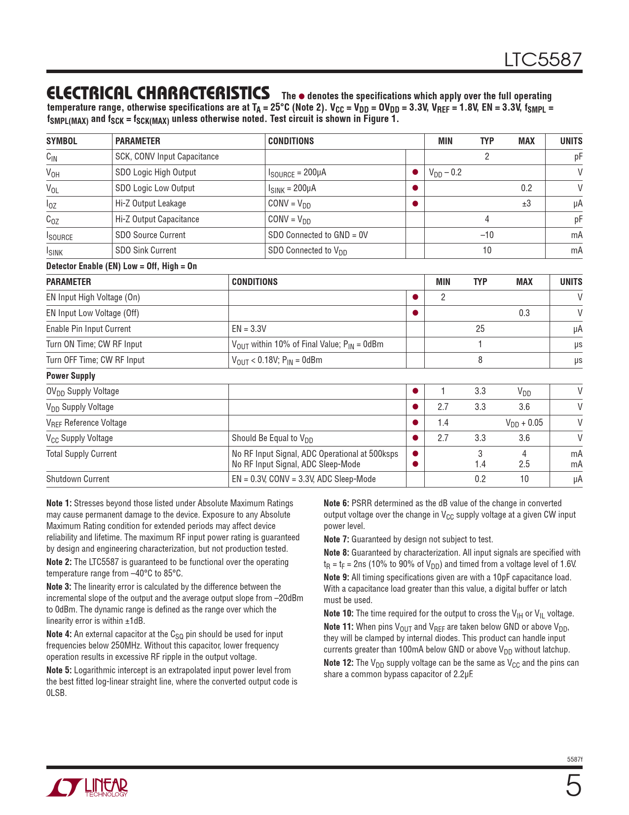 LTC5587 ELECTRICAL CHARACTERISTICSThe l denotes the specifications which apply over the full operatingtemperature range, otherwise specifications are at TA = 25°C (Note 2). VCC = VDD = OVDD = 3.3V, VREF = 1.8V, EN = 3.3V, fSMPL =fSMPL(MAX) and fSCK = fSCK(MAX) unless otherwise noted. Test circuit is shown in Figure 1.SYMBOLPARAMETERCONDITIONSMINTYPMAXUNITS CIN SCK, CONV Input Capacitance 2 pF VOH SDO Logic High Output ISOURCE = 200μA l VDD – 0.2 V VOL SDO Logic Low Output ISINK = 200μA l 0.2 V IOZ Hi-Z Output Leakage CONV = VDD l ±3 μA COZ Hi-Z Output Capacitance CONV = VDD 4 pF ISOURCE SDO Source Current SDO Connected to GND = 0V –10 mA ISINK SDO Sink Current SDO Connected to VDD 10 mA Detector Enable (EN) Low = Off, High = OnPARAMETERCONDITIONSMINTYPMAXUNITS EN Input High Voltage (On) l 2 V EN Input Low Voltage (Off) l 0.3 V Enable Pin Input Current EN = 3.3V 25 μA Turn ON Time; CW RF Input VOUT within 10% of Final Value; PIN = 0dBm 1 μs Turn OFF Time; CW RF Input VOUT < 0.18V; PIN = 0dBm 8 μs Power Supply OVDD Supply Voltage l 1 3.3 VDD V VDD Supply Voltage l 2.7 3.3 3.6 V VREF Reference Voltage l 1.4 VDD + 0.05 V VCC Supply Voltage Should Be Equal to VDD l 2.7 3.3 3.6 V Total Supply Current No RF Input Signal, ADC Operational at 500ksps l 3 4 mA No RF Input Signal, ADC Sleep-Mode l 1.4 2.5 mA Shutdown Current EN = 0.3V, CONV = 3.3V, ADC Sleep-Mode 0.2 10 μA Note 1: Stresses beyond those listed under Absolute Maximum Ratings Note 6: PSRR determined as the dB value of the change in converted may cause permanent damage to the device. Exposure to any Absolute output voltage over the change in VCC supply voltage at a given CW input Maximum Rating condition for extended periods may affect device power level. reliability and lifetime. The maximum RF input power rating is guaranteed Note 7: Guaranteed by design not subject to test. by design and engineering characterization, but not production tested. Note 8: Guaranteed by characterization. All input signals are specified with Note 2: The LTC5587 is guaranteed to be functional over the operating tR = tF = 2ns (10% to 90% of VDD) and timed from a voltage level of 1.6V. temperature range from –40°C to 85°C. Note 9: All timing specifications given are with a 10pF capacitance load. Note 3: The linearity error is calculated by the difference between the With a capacitance load greater than this value, a digital buffer or latch incremental slope of the output and the average output slope from –20dBm must be used. to 0dBm. The dynamic range is defined as the range over which the Note 10: The time required for the output to cross the VIH or VIL voltage. linearity error is within ±1dB. Note 11: When pins VOUT and VREF are taken below GND or above VDD, Note 4: An external capacitor at the CSQ pin should be used for input they will be clamped by internal diodes. This product can handle input frequencies below 250MHz. Without this capacitor, lower frequency currents greater than 100mA below GND or above VDD without latchup. operation results in excessive RF ripple in the output voltage. Note 12: The VDD supply voltage can be the same as VCC and the pins can Note 5: Logarithmic intercept is an extrapolated input power level from share a common bypass capacitor of 2.2μF. the best fitted log-linear straight line, where the converted output code is 0LSB. 5587f 5 Document Outline FEATURES DESCRIPTION APPLICATIONS BLOCK DIAGRAM ABSOLUTE MAXIMUM RATINGS PIN CONFIGURATION ORDER INFORMATION ELECTRICAL CHARACTERISTICS TYPICAL PERFORMANCE CHARACTERISTICS PIN FUNCTIONS BLOCK DIAGRAM TIMING DIAGRAMS TEST CIRCUIT APPLICATIONS INFORMATION PACKAGE DESCRIPTION TYPICAL APPLICATION RELATED PARTS