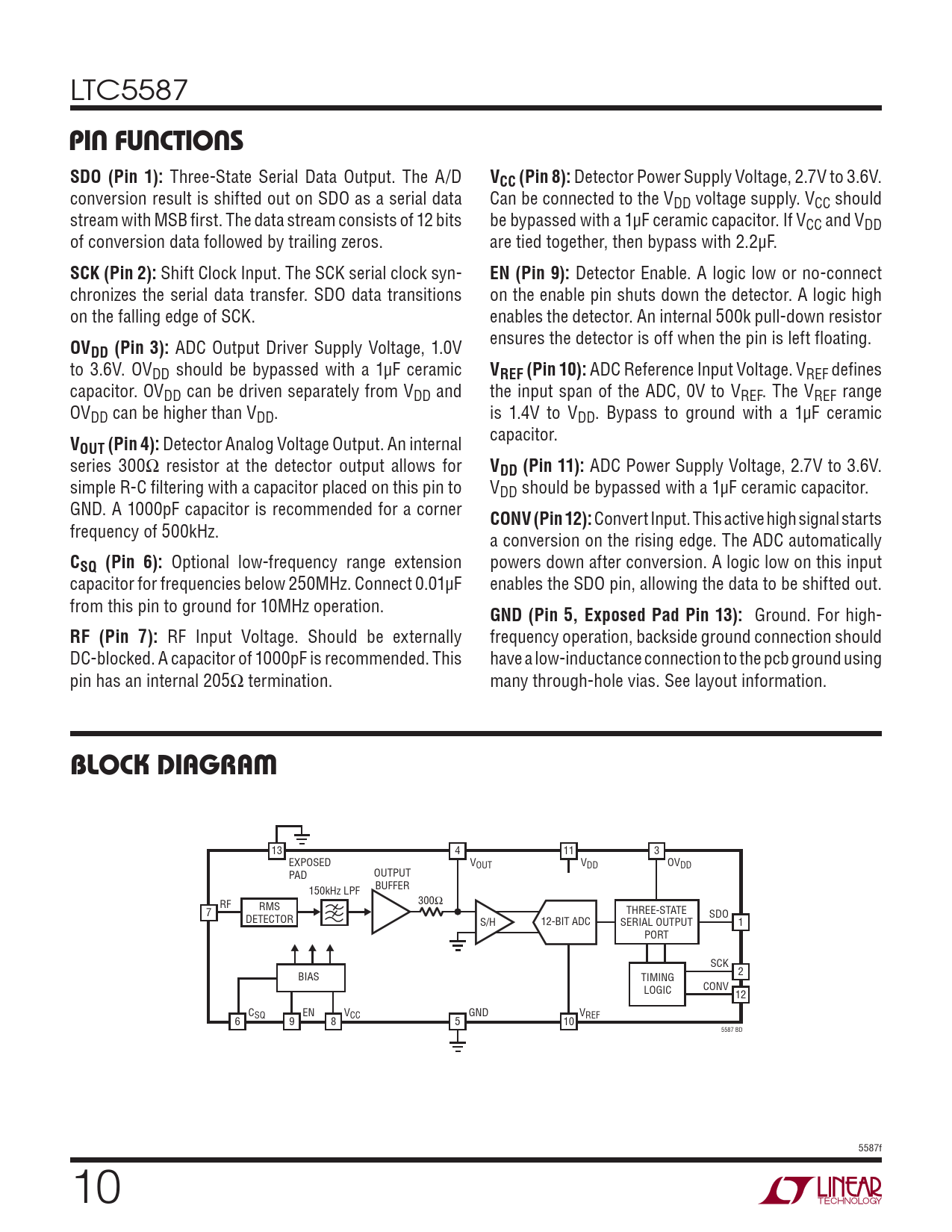 LTC5587 PIN FUNCTIONSSDO (Pin 1): Three-State Serial Data Output. The A/D VCC (Pin 8): Detector Power Supply Voltage, 2.7V to 3.6V. conversion result is shifted out on SDO as a serial data Can be connected to the VDD voltage supply. VCC should stream with MSB first. The data stream consists of 12 bits be bypassed with a 1μF ceramic capacitor. If VCC and VDD of conversion data followed by trailing zeros. are tied together, then bypass with 2.2μF. SCK (Pin 2): Shift Clock Input. The SCK serial clock syn- EN (Pin 9): Detector Enable. A logic low or no-connect chronizes the serial data transfer. SDO data transitions on the enable pin shuts down the detector. A logic high on the falling edge of SCK. enables the detector. An internal 500k pull-down resistor ensures the detector is off when the pin is left floating. OVDD (Pin 3): ADC Output Driver Supply Voltage, 1.0V to 3.6V. OVDD should be bypassed with a 1μF ceramic VREF (Pin 10): ADC Reference Input Voltage. VREF defines capacitor. OVDD can be driven separately from VDD and the input span of the ADC, 0V to VREF. The VREF range OVDD can be higher than VDD. is 1.4V to VDD. Bypass to ground with a 1μF ceramic capacitor. VOUT (Pin 4): Detector Analog Voltage Output. An internal series 300Ω resistor at the detector output allows for VDD (Pin 11): ADC Power Supply Voltage, 2.7V to 3.6V. simple R-C filtering with a capacitor placed on this pin to VDD should be bypassed with a 1μF ceramic capacitor. GND. A 1000pF capacitor is recommended for a corner CONV (Pin 12): Convert Input. This active high signal starts frequency of 500kHz. a conversion on the rising edge. The ADC automatically CSQ (Pin 6): Optional low-frequency range extension powers down after conversion. A logic low on this input capacitor for frequencies below 250MHz. Connect 0.01μF enables the SDO pin, allowing the data to be shifted out. from this pin to ground for 10MHz operation. GND (Pin 5, Exposed Pad Pin 13): Ground. For high- RF (Pin 7): RF Input Voltage. Should be externally frequency operation, backside ground connection should DC-blocked. A capacitor of 1000pF is recommended. This have a low-inductance connection to the pcb ground using pin has an internal 205Ω termination. many through-hole vias. See layout information. BLOCK DIAGRAM 13 4 11 3 EXPOSED VOUT VDD OVDD PAD OUTPUT BUFFER 150kHz LPF RF 300Ω RMS 7 THREE-STATE SDO DETECTOR S/H 12-BIT ADC SERIAL OUTPUT 1 PORT SCK 2 BIAS TIMING CONV LOGIC 12 C EN V GND V SQ CC REF 6 9 8 5 10 5587 BD 5587f 10 Document Outline FEATURES DESCRIPTION APPLICATIONS BLOCK DIAGRAM ABSOLUTE MAXIMUM RATINGS PIN CONFIGURATION ORDER INFORMATION ELECTRICAL CHARACTERISTICS TYPICAL PERFORMANCE CHARACTERISTICS PIN FUNCTIONS BLOCK DIAGRAM TIMING DIAGRAMS TEST CIRCUIT APPLICATIONS INFORMATION PACKAGE DESCRIPTION TYPICAL APPLICATION RELATED PARTS