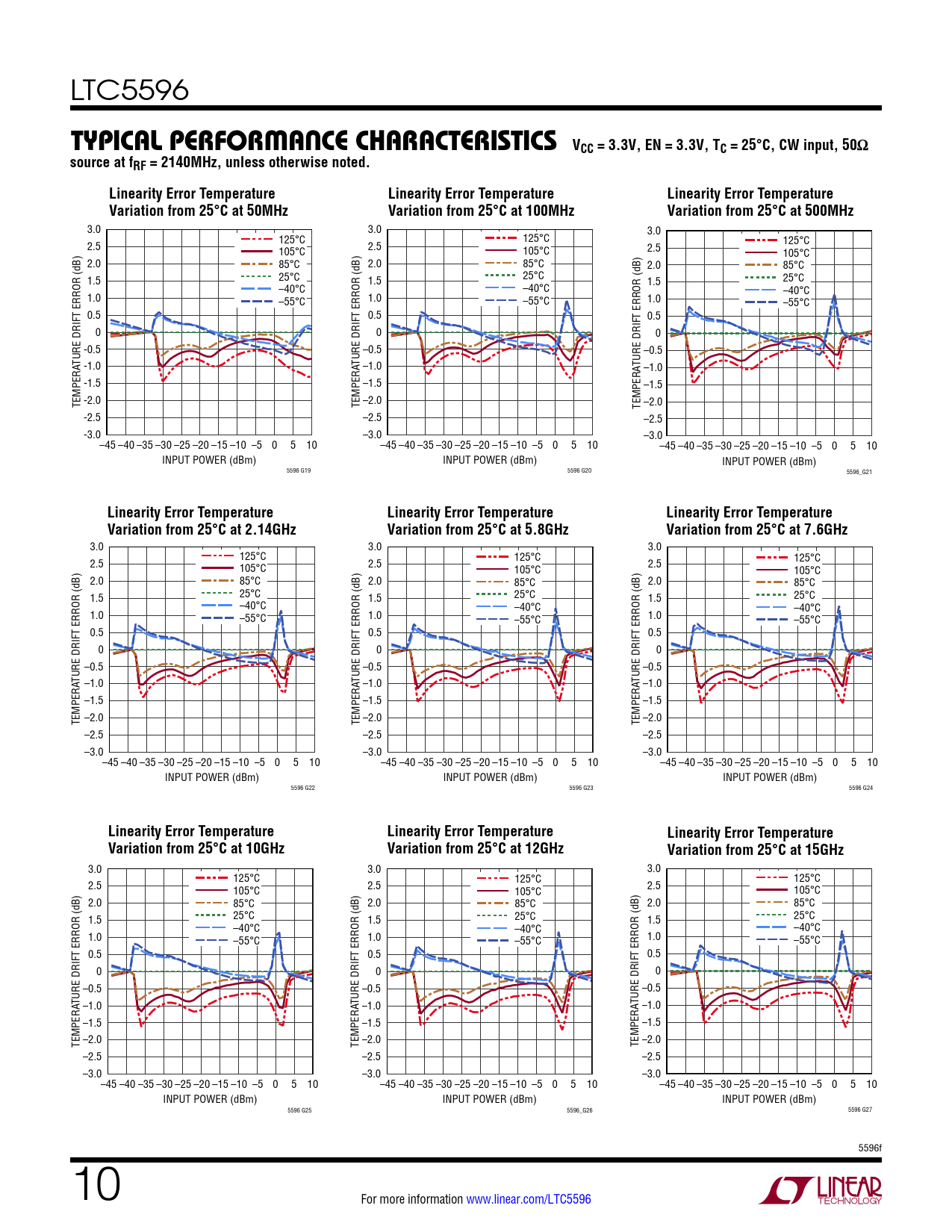3.0 3.0 3.0 125°C 2.5 125°C 125°C 105°C 2.5 105°C 2.5 105°C 2.0 85°C 2.0 85°C 2.0 85°C 1.5 25°C 1.5 25°C 1.5 25°C –40°C –40°C –40°C 1.0 –55°C 1.0 –55°C 1.0 –55°C T ERROR (dB) 0.5 T ERROR (dB) 0.5 T ERROR (dB) 0.5 0 0 0 –0.5 –0.5 –0.5 TURE DRIF –1.0 TURE DRIF –1.0 TURE DRIF –1.0 –1.5 –1.5 –1.5 –2.0 TEMPERA –2.0 TEMPERA –2.0 TEMPERA –2.5 –2.5 –2.5 –3.0 –3.0 –3.0 –45 –40 –35 –30 –25 –20 –15 –10 –5 0 5 10 –45 –40 –35 –30 –25 –20 –15 –10 –5 0 5 10 –45 –40 –35 –30 –25 –20 –15 –10 –5 0 5 10 INPUT POWER (dBm) INPUT POWER (dBm) INPUT POWER (dBm) 5596 G22 5596 G23 5596 G24