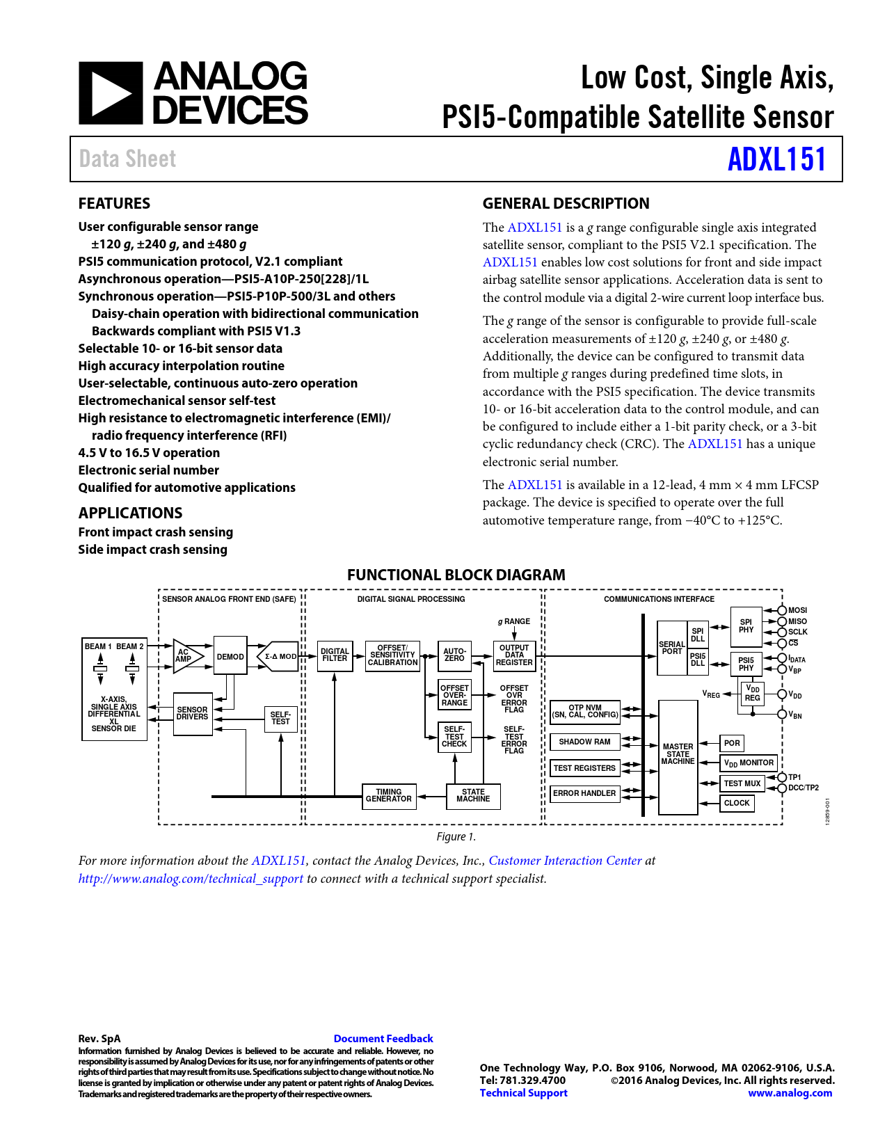 Low Cost, Single Axis,. PSI5-Compatible Satel ite Sensor. Data Sheet. ADXL151. FEATURES. GENERAL DESCRIPTION