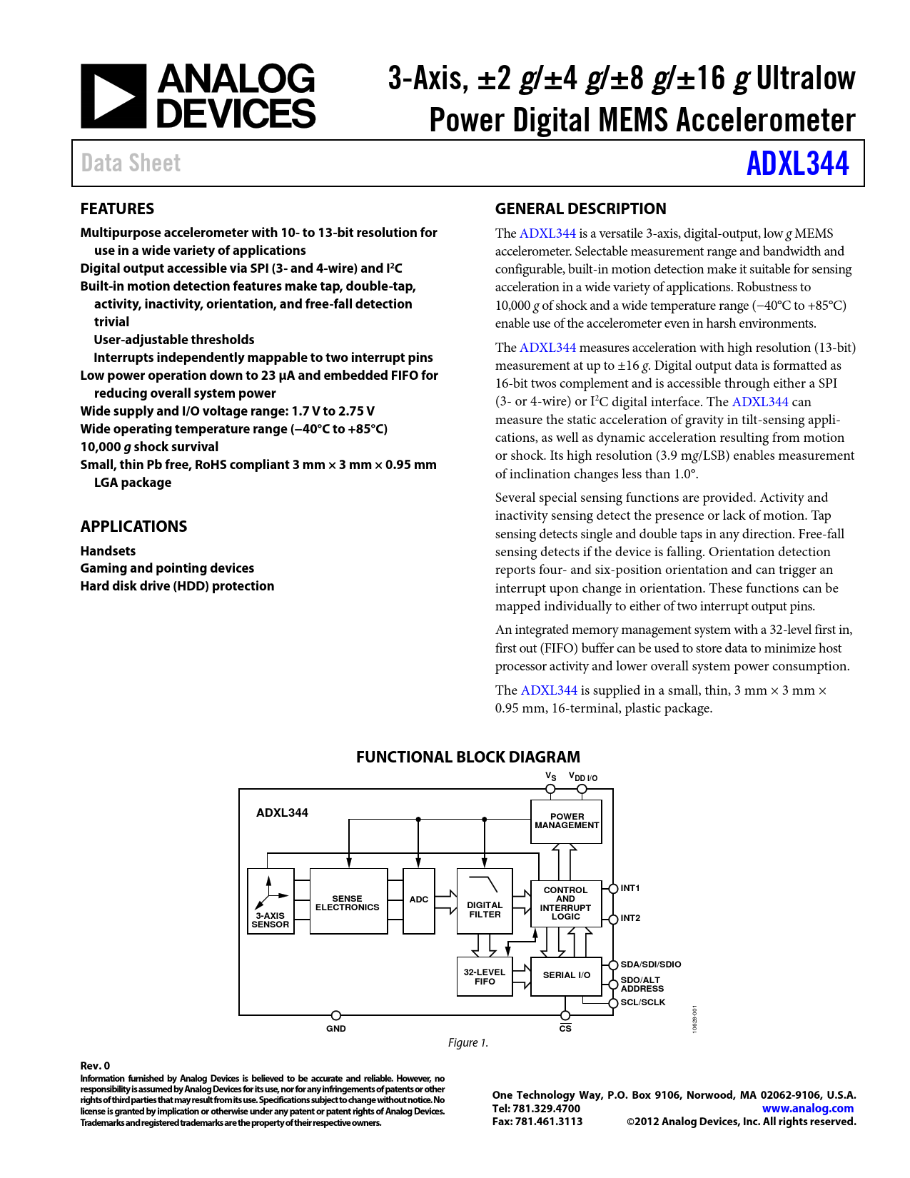 interrupt upon change in orientation. These functions can be mapped individual y to either of two interrupt output pins. An integrated memory management system with a 32-level first in, first out (FIFO) buffer can be used to store data to minimize host processor activity and lower overall system power consumption. The ADXL344 is supplied in a small, thin, 3 mm × 3 mm × 0.95 mm, 16-terminal, plastic package.