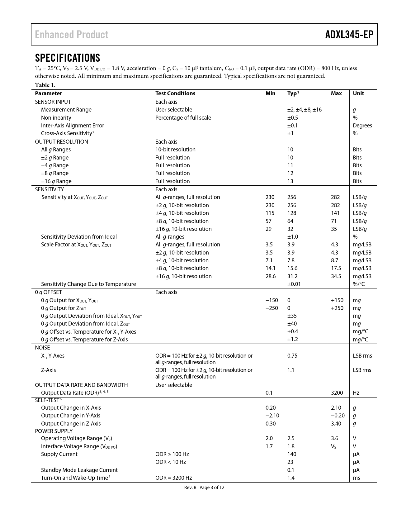 Enhanced Product. ADXL345-EP. SPECIFICATIONS. Table 1. Parameter. Test Conditions. Min. Typ1. Max. Unit