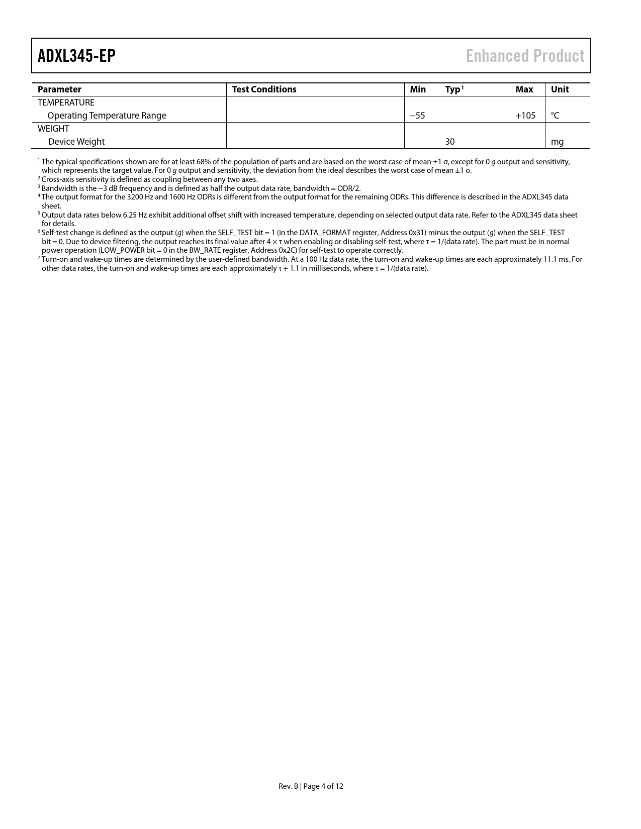 link to page 4 ADXL345-EPEnhanced ProductParameterTest ConditionsMinTyp1MaxUnit TEMPERATURE Operating Temperature Range −55 +105 °C WEIGHT Device Weight 30 mg 1 The typical specifications shown are for at least 68% of the population of parts and are based on the worst case of mean ±1 σ, except for 0 g output and sensitivity, which represents the target value. For 0 g output and sensitivity, the deviation from the ideal describes the worst case of mean ±1 σ. 2 Cross-axis sensitivity is defined as coupling between any two axes. 3 Bandwidth is the −3 dB frequency and is defined as half the output data rate, bandwidth = ODR/2. 4 The output format for the 3200 Hz and 1600 Hz ODRs is different from the output format for the remaining ODRs. This difference is described in the ADXL345 data sheet. 5 Output data rates below 6.25 Hz exhibit additional offset shift with increased temperature, depending on selected output data rate. Refer to the ADXL345 data sheet for details. 6 Self-test change is defined as the output (g) when the SELF_TEST bit = 1 (in the DATA_FORMAT register, Address 0x31) minus the output (g) when the SELF_TEST bit = 0. Due to device filtering, the output reaches its final value after 4 × τ when enabling or disabling self-test, where τ = 1/(data rate). The part must be in normal power operation (LOW_POWER bit = 0 in the BW_RATE register, Address 0x2C) for self-test to operate correctly. 7 Turn-on and wake-up times are determined by the user-defined bandwidth. At a 100 Hz data rate, the turn-on and wake-up times are each approximately 11.1 ms. For other data rates, the turn-on and wake-up times are each approximately τ + 1.1 in milliseconds, where τ = 1/(data rate). Rev. B | Page 4 of 12 Document Outline Features Enhanced Product Features Applications General Description Functional Block Diagram Revision History Related Documents Specifications Absolute Maximum Ratings Thermal Resistance ESD Caution Pin Configuration and Function Descriptions Typical Performance Characteristics Outline Dimensions Ordering Guide