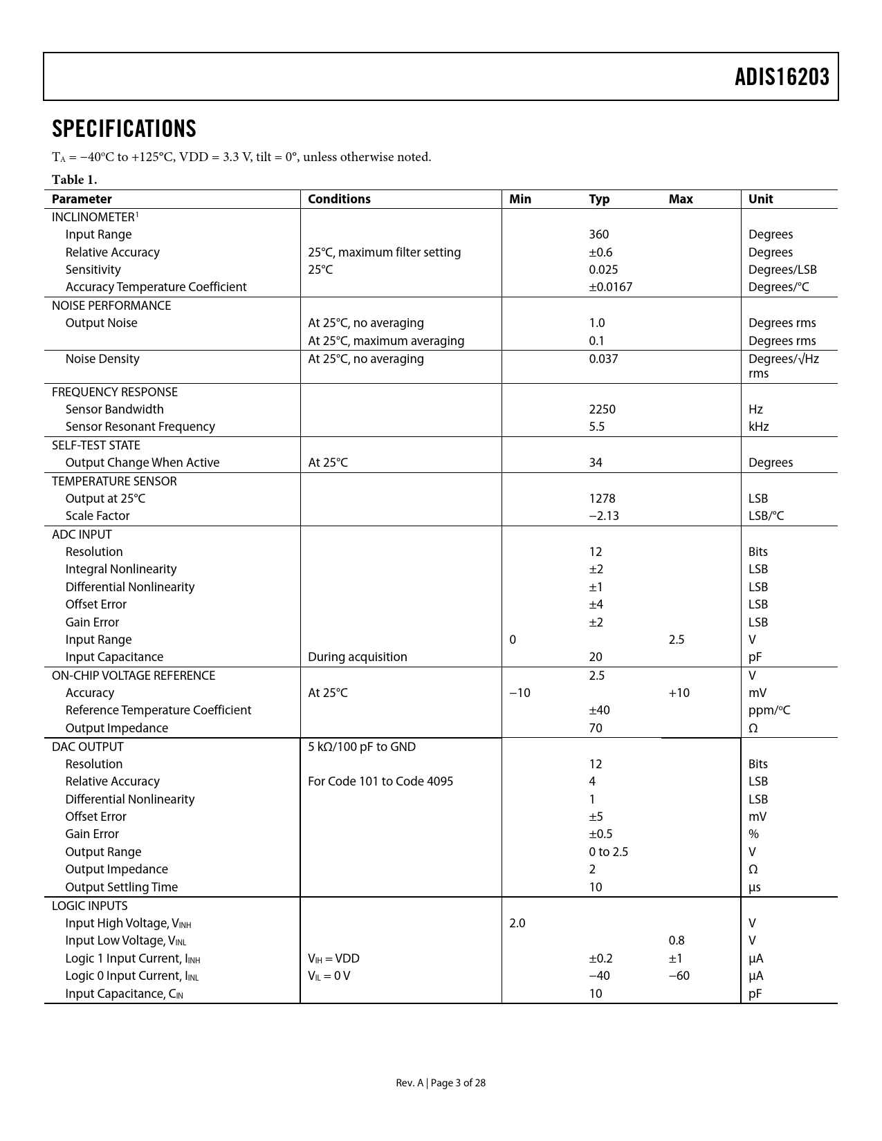 ADIS16203. SPECIFICATIONS. Table 1. Parameter Conditions. Min. Typ. Max. Unit