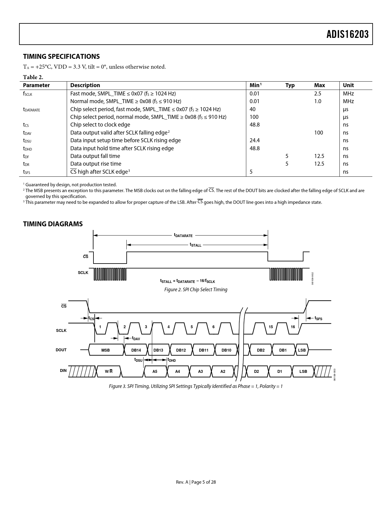 ADIS16203. TIMING SPECIFICATIONS. Table 2. Parameter Description. Min1. Typ. Max. Unit. TIMING DIAGRAMS. tDATARATE. tSTALL. SCLK