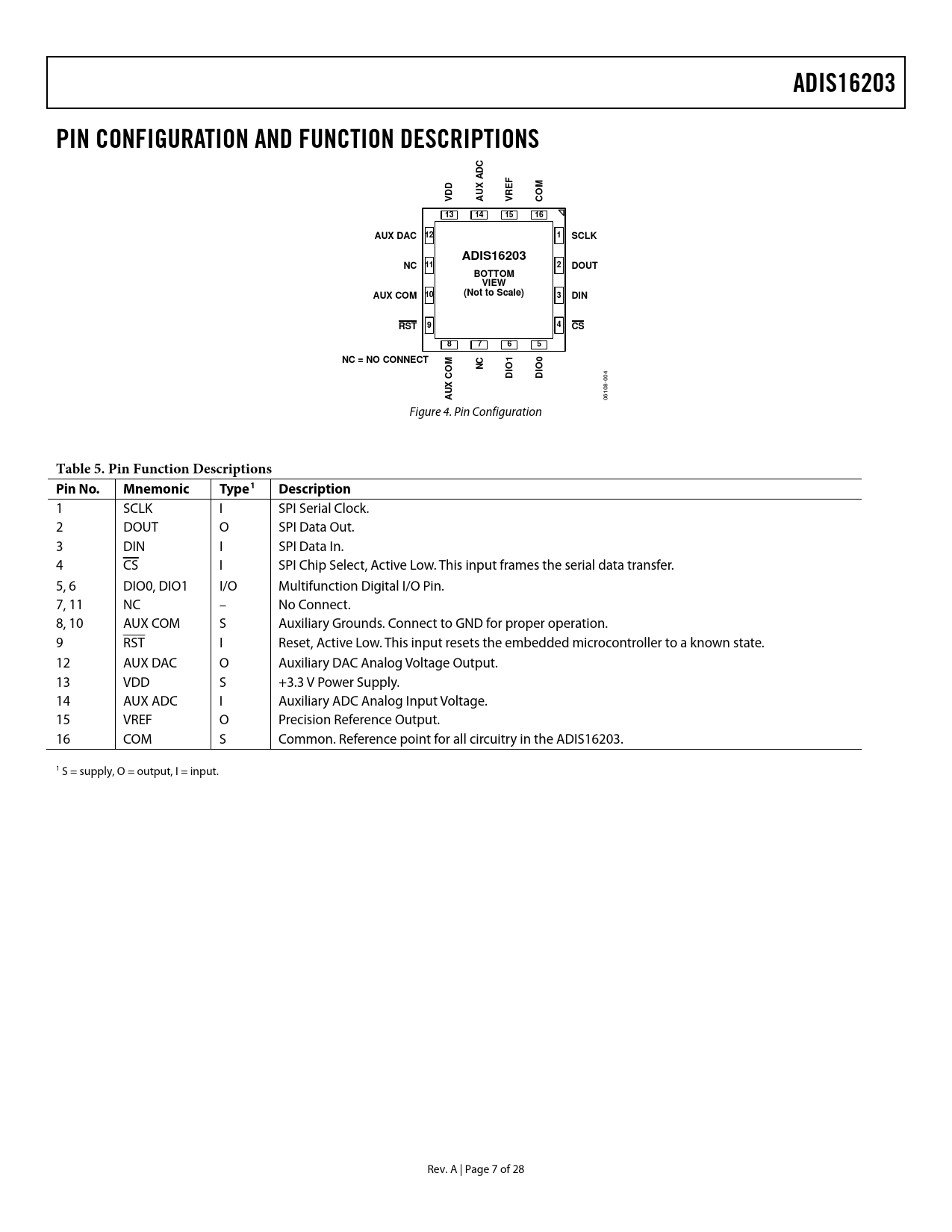 link to page 8 ADIS16203PIN CONFIGURATION AND FUNCTION DESCRIPTIONSC D AFDXEMDUROVAVC13141516AUX DAC 121SCLKADIS16203NC 112DOUTBOTTOMVIEWAUX COM(Not to Scale)103DINRST94CS8765NC = NO CONNECTMC10NOOIOICDD 04 0 X 8- U 10 A 06 Figure 4. Pin Configuration Table 5. Pin Function Descriptions Pin No.MnemonicType1 Description 1 SCLK I SPI Serial Clock. 2 DOUT O SPI Data Out. 3 DIN I SPI Data In. 4 CS I SPI Chip Select, Active Low. This input frames the serial data transfer. 5, 6 DIO0, DIO1 I/O Multifunction Digital I/O Pin. 7, 11 NC – No Connect. 8, 10 AUX COM S Auxiliary Grounds. Connect to GND for proper operation. 9 RST I Reset, Active Low. This input resets the embedded microcontroller to a known state. 12 AUX DAC O Auxiliary DAC Analog Voltage Output. 13 VDD S +3.3 V Power Supply. 14 AUX ADC I Auxiliary ADC Analog Input Voltage. 15 VREF O Precision Reference Output. 16 COM S Common. Reference point for all circuitry in the ADIS16203. 1 S = supply, O = output, I = input. Rev. A | Page 7 of 28 Document Outline FEATURES APPLICATIONS GENERAL DESCRIPTION FUNCTIONAL BLOCK DIAGRAM TABLE OF CONTENTS REVISION HISTORY SPECIFICATIONS TIMING SPECIFICATIONS TIMING DIAGRAMS ABSOLUTE MAXIMUM RATINGS ESD CAUTION PIN CONFIGURATION AND FUNCTION DESCRIPTIONS TYPICAL PERFORMACE CHARACTERISTICS THEORY OF OPERATION OUTPUT RESPONSE TEMPERATURE SENSOR BASIC OPERATION SERIAL PERIPHERAL INTERFACE (SPI) DATA OUTPUT REGISTER ACCESS PROGRAMMING AND CONTROL CONTROL REGISTER OVERVIEW CONTROL REGISTER ACCESS CONTROL REGISTER DETAILS CALIBRATION CALIBRATION REGISTER DEFINITION INCL_NULL Register Definition ALARMS ALM_MAG1 Register Definition ALM_SMPL1 Register Definition ALM_MAG2 Register Definition ALM_SMPL2 Register Definition ALM_CTRL Register Definition SAMPLE PERIOD CONTROL SMPL_TIME Register Definition FILTERING CONTROL AVG_CNT Register Definition POWER-DOWN CONTROL SLP_CNT Register Definition STATUS FEEDBACK STATUS Register Definition COMMAND CONTROL COMMAND Register Definition MISCELLANEOUS CONTROL REGISTER MSC_CTRL Register Definition PERIPHERALS AUXILIARY ADC FUNCTION AUXILIARY DAC FUNCTION AUX_DAC Register Definition GENERAL-PURPOSE I/O CONTROL GPIO_CTRL Register Definition APPLICATIONS HARDWARE CONSIDERATIONS GROUNDING AND BOARD LAYOUT RECOMMENDATIONS SELF-TEST TIPS BAND GAP REFERENCE POWER-ON RESET OPERATION SECOND-LEVEL ASSEMBLY EXAMPLE PAD LAYOUT OUTLINE DIMENSIONS ORDERING GUIDE