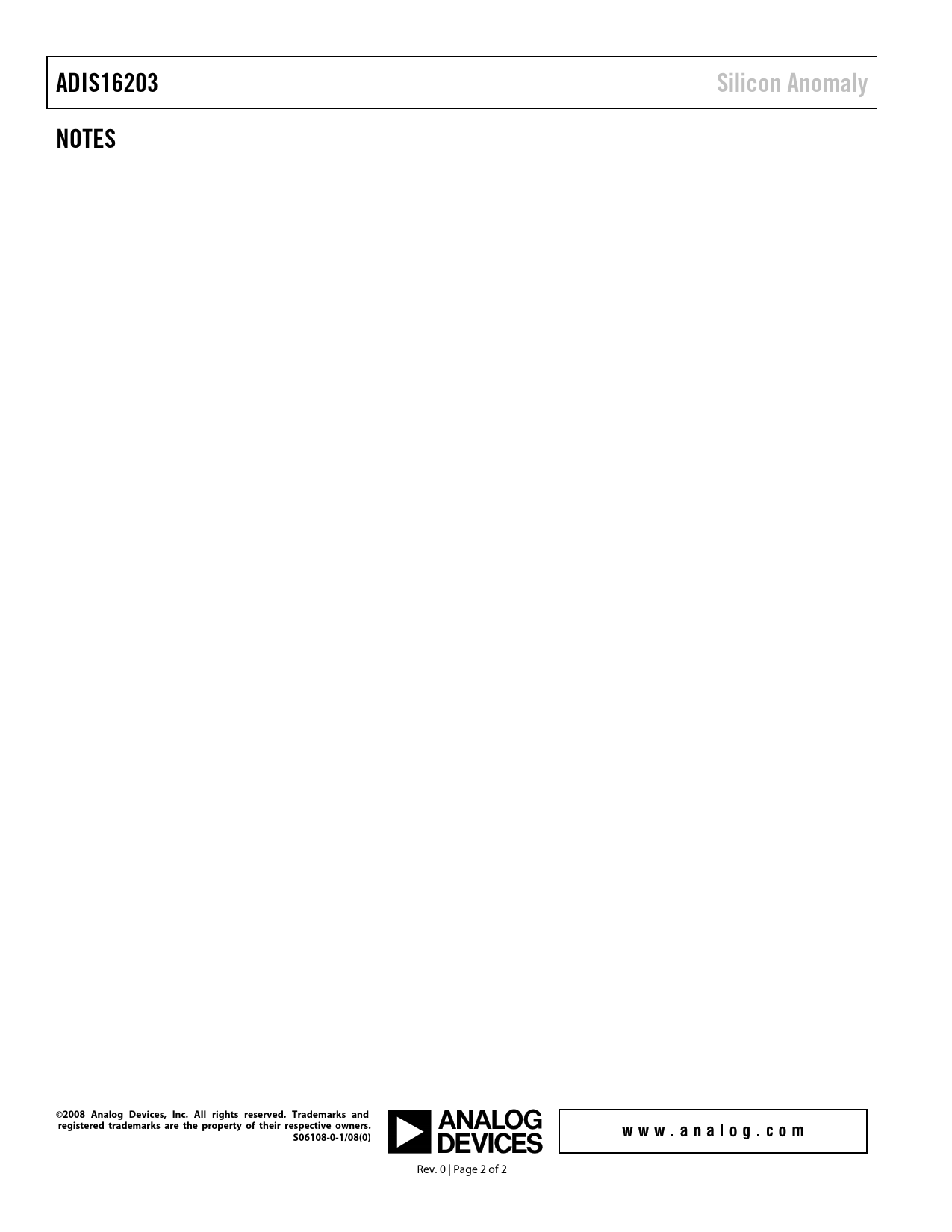 ADIS16203 Silicon Anomaly NOTES ©2008 Analog Devices, Inc. All rights reserved. Trademarks and registered trademarks are the property of their respective owners. S06108-0-1/08(0)