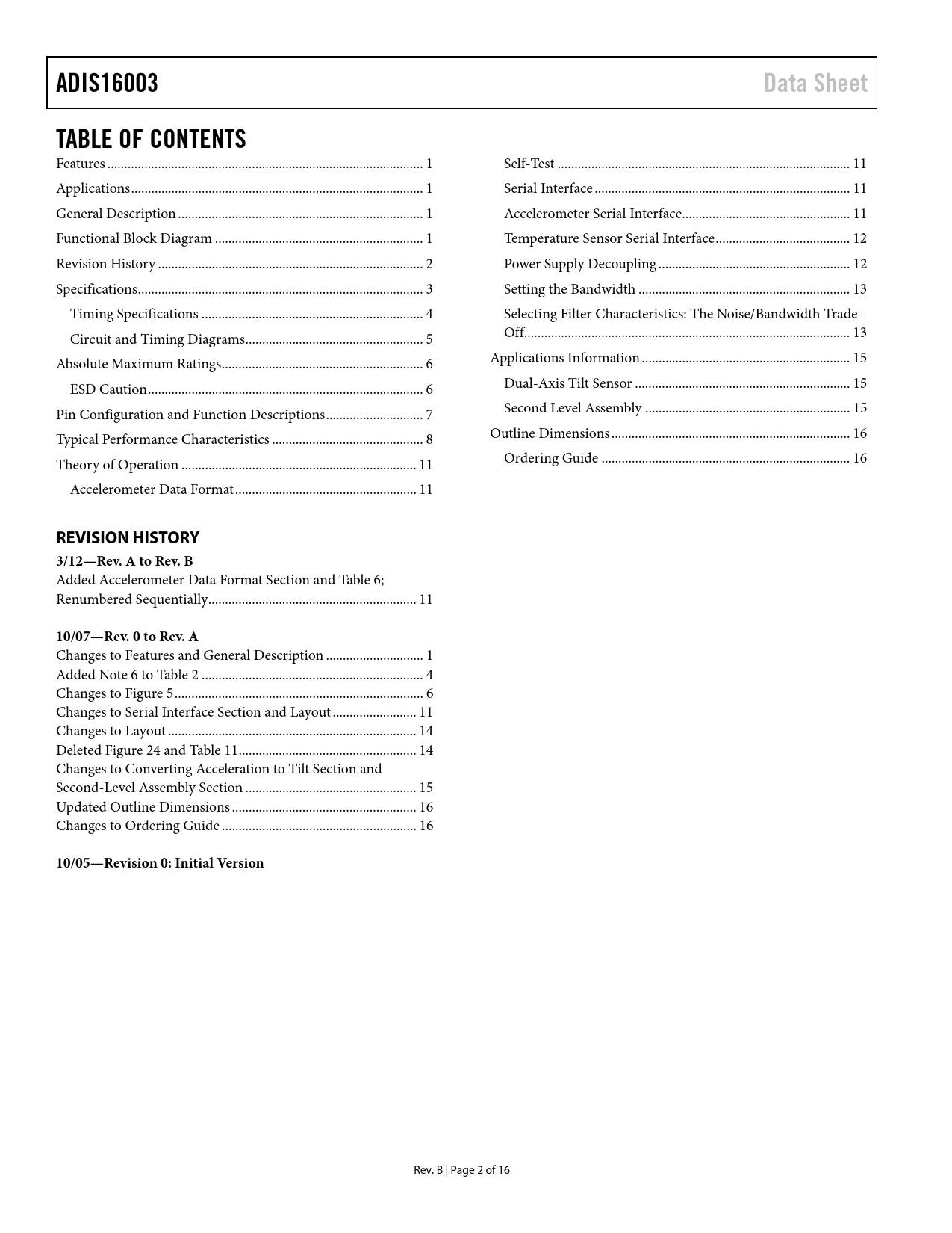link to page 1 link to page 1 link to page 1 link to page 1 link to page 3 link to page 4 link to page 5 link to page 6 link to page 7 link to page 7 link to page 8 link to page 9 link to page 12 link to page 12 link to page 12 link to page 12 link to page 12 link to page 13 link to page 13 link to page 14 link to page 14 link to page 14 link to page 16 link to page 16 link to page 16 link to page 17 link to page 17 ADIS16003Data SheetTABLE OF CONTENTS Features .. 1 Self-Test ... 11 Applications... 1 Serial Interface .. 11 General Description ... 1 Accelerometer Serial Interface.. 11 Functional Block Diagram .. 1 Temperature Sensor Serial Interface.. 12 Revision History ... 2 Power Supply Decoupling ... 12 Specifications... 3 Setting the Bandwidth ... 13 Timing Specifications .. 4 Selecting Filter Characteristics: The Noise/Bandwidth Trade- Circuit and Timing Diagrams... 5 Off... 13 Absolute Maximum Ratings.. 6 Applications Information .. 15 ESD Caution.. 6 Dual-Axis Tilt Sensor .. 15 Pin Configuration and Function Descriptions... 7 Second Level Assembly ... 15 Typical Performance Characteristics ... 8 Outline Dimensions ... 16 Theory of Operation .. 11 Ordering Guide .. 16 Accelerometer Data Format.. 11 REVISION HISTORY3/12—Rev. A to Rev. B Added Accelerometer Data Format Section and Table 6; Renumbered Sequentially.. 11 10/07—Rev. 0 to Rev. A Changes to Features and General Description ... 1 Added Note 6 to Table 2 .. 4 Changes to Figure 5.. 6 Changes to Serial Interface Section and Layout ... 11 Changes to Layout .. 14 Deleted Figure 24 and Table 11... 14 Changes to Converting Acceleration to Tilt Section and Second-Level Assembly Section ... 15 Updated Outline Dimensions ... 16 Changes to Ordering Guide .. 16 10/05—Revision 0: Initial Version Rev. B | Page 2 of 16 Document Outline FEATURES APPLICATIONS GENERAL DESCRIPTION FUNCTIONAL BLOCK DIAGRAM TABLE OF CONTENTS REVISION HISTORY SPECIFICATIONS TIMING SPECIFICATIONS CIRCUIT AND TIMING DIAGRAMS ABSOLUTE MAXIMUM RATINGS ESD CAUTION PIN CONFIGURATION AND FUNCTION DESCRIPTIONS TYPICAL PERFORMANCE CHARACTERISTICS THEORY OF OPERATION ACCELEROMETER DATA FORMAT SELF-TEST SERIAL INTERFACE ACCELEROMETER SERIAL INTERFACE Accelerometer Control Register Power Down ADD0 ZERO ONE DONTC Accelerometer Conversion Details TEMPERATURE SENSOR SERIAL INTERFACE Read Operation Write Operation Temperature Sensor Control Register ZERO Output Data Format Temperature Sensor Conversion Details POWER SUPPLY DECOUPLING SETTING THE BANDWIDTH SELECTING FILTER CHARACTERISTICS:THE NOISE/BANDWIDTH TRADE-OFF APPLICATIONS INFORMATION DUAL-AXIS TILT SENSOR Converting Acceleration to Tilt SECOND LEVEL ASSEMBLY OUTLINE DIMENSIONS ORDERING GUIDE
