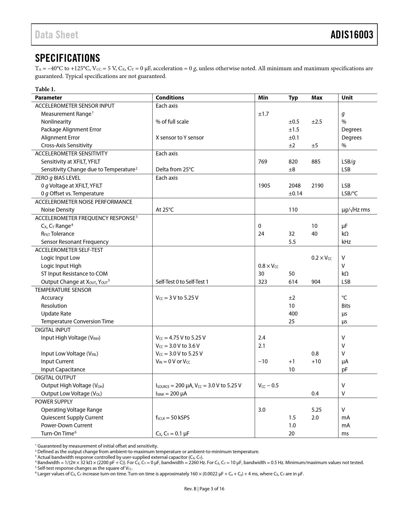 Data Sheet ADIS16003 SPECIFICATIONS Table 1 Parameter Conditions Min Typ Max Unit