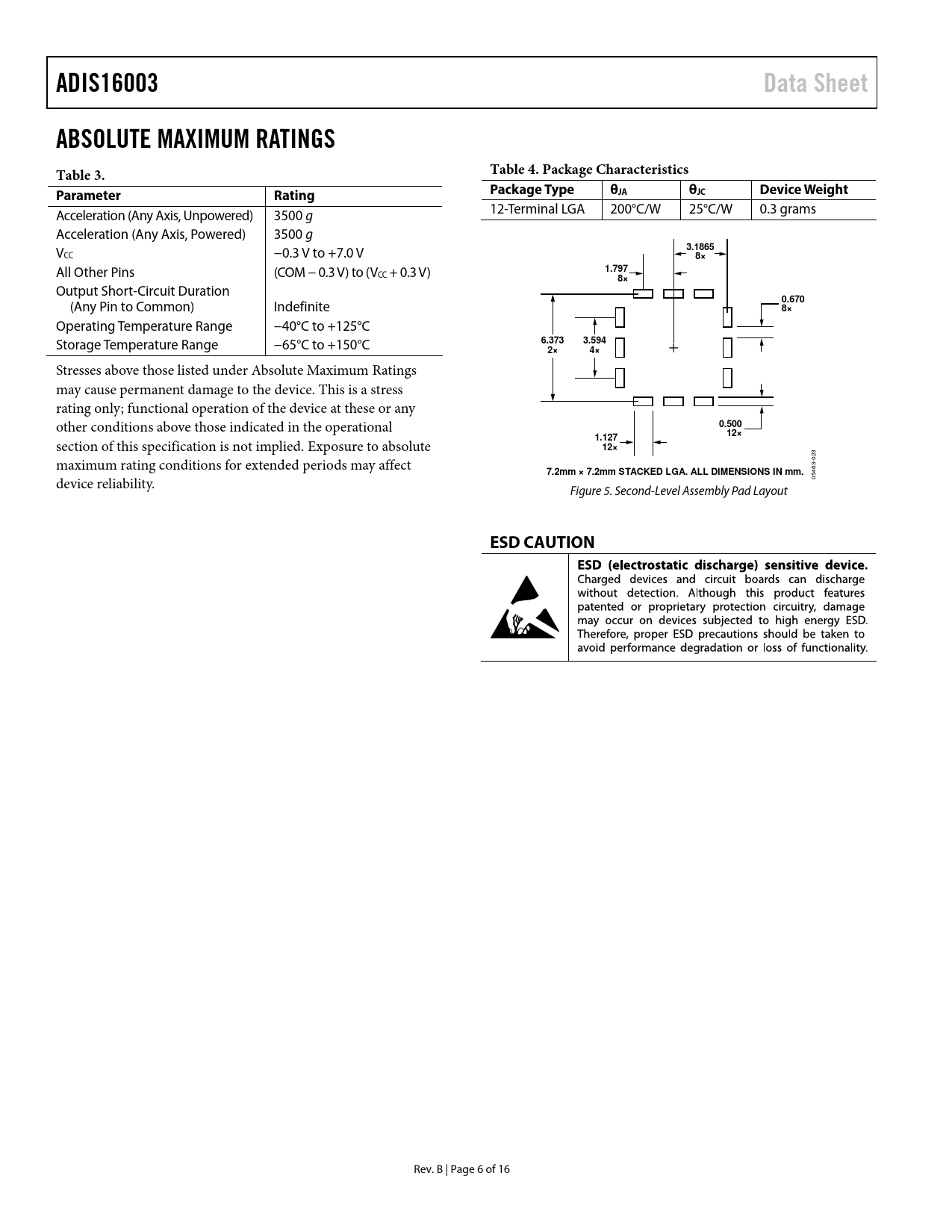 ADIS16003Data SheetABSOLUTE MAXIMUM RATINGSTable 4. Package CharacteristicsTable 3.Package TypeθJAθJC DeviceWeightParameter Rating 12-Terminal LGA 200°C/W 25°C/W 0.3 grams Acceleration (Any Axis, Unpowered) 3500 g Acceleration (Any Axis, Powered) 3500 g 3.1865 VCC −0.3 V to +7.0 V 8× All Other Pins (COM − 0.3 V) to (V 1.797 CC + 0.3 V) 8× Output Short-Circuit Duration 0.670 (Any Pin to Common) Indefinite 8× Operating Temperature Range −40°C to +125°C Storage Temperature Range −65°C to +150°C 6.3733.5942×4× Stresses above those listed under Absolute Maximum Ratings may cause permanent damage to the device. This is a stress rating only; functional operation of the device at these or any 0.500 other conditions above those indicated in the operational 1.12712× section of this specification is not implied. Exposure to absolute 12× 23 0 3- maximum rating conditions for extended periods may affect 46 7.2mm × 7.2mm STACKED LGA. ALL DIMENSIONS IN mm. 05 device reliability. Figure 5. Second-Level Assembly Pad Layout ESD CAUTION Rev. B | Page 6 of 16 Document Outline FEATURES APPLICATIONS GENERAL DESCRIPTION FUNCTIONAL BLOCK DIAGRAM TABLE OF CONTENTS REVISION HISTORY SPECIFICATIONS TIMING SPECIFICATIONS CIRCUIT AND TIMING DIAGRAMS ABSOLUTE MAXIMUM RATINGS ESD CAUTION PIN CONFIGURATION AND FUNCTION DESCRIPTIONS TYPICAL PERFORMANCE CHARACTERISTICS THEORY OF OPERATION ACCELEROMETER DATA FORMAT SELF-TEST SERIAL INTERFACE ACCELEROMETER SERIAL INTERFACE Accelerometer Control Register Power Down ADD0 ZERO ONE DONTC Accelerometer Conversion Details TEMPERATURE SENSOR SERIAL INTERFACE Read Operation Write Operation Temperature Sensor Control Register ZERO Output Data Format Temperature Sensor Conversion Details POWER SUPPLY DECOUPLING SETTING THE BANDWIDTH SELECTING FILTER CHARACTERISTICS:THE NOISE/BANDWIDTH TRADE-OFF APPLICATIONS INFORMATION DUAL-AXIS TILT SENSOR Converting Acceleration to Tilt SECOND LEVEL ASSEMBLY OUTLINE DIMENSIONS ORDERING GUIDE