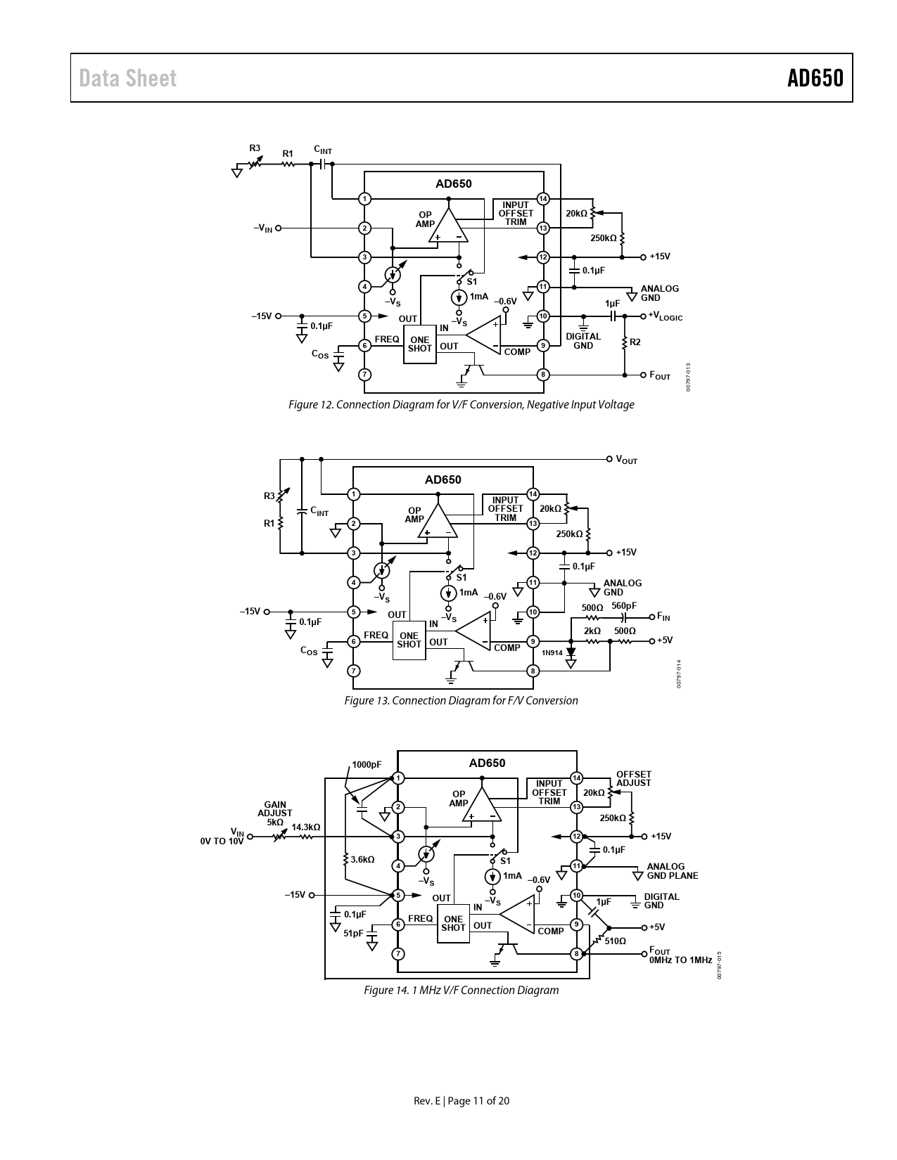 7- 79 00 Figure 14. 1 MHz V/F Connection Diagram Rev. E | Page 11 of 20 Document Outline Features Functional Block Diagram Product Description Product Highlights Revision History Specifications Absolute Maximum Ratings ESD Caution Pin Configurations and Function Descriptions Circuit Operation Unipolar Configuration One-Shot Timing Component Selection Bipolar V/F Unipolar V/F, Negative Input Voltage F/V Conversion High Frequency Operation Decoupling and Grounding Temperature Coefficients Nonlinearity Specification PSRR Other Circuit Considerations Applications Differential Voltage-to-Frequency Conversion Autozero Circuit Phase-Locked Loop F/V Conversion Outline Dimensions Ordering Guide