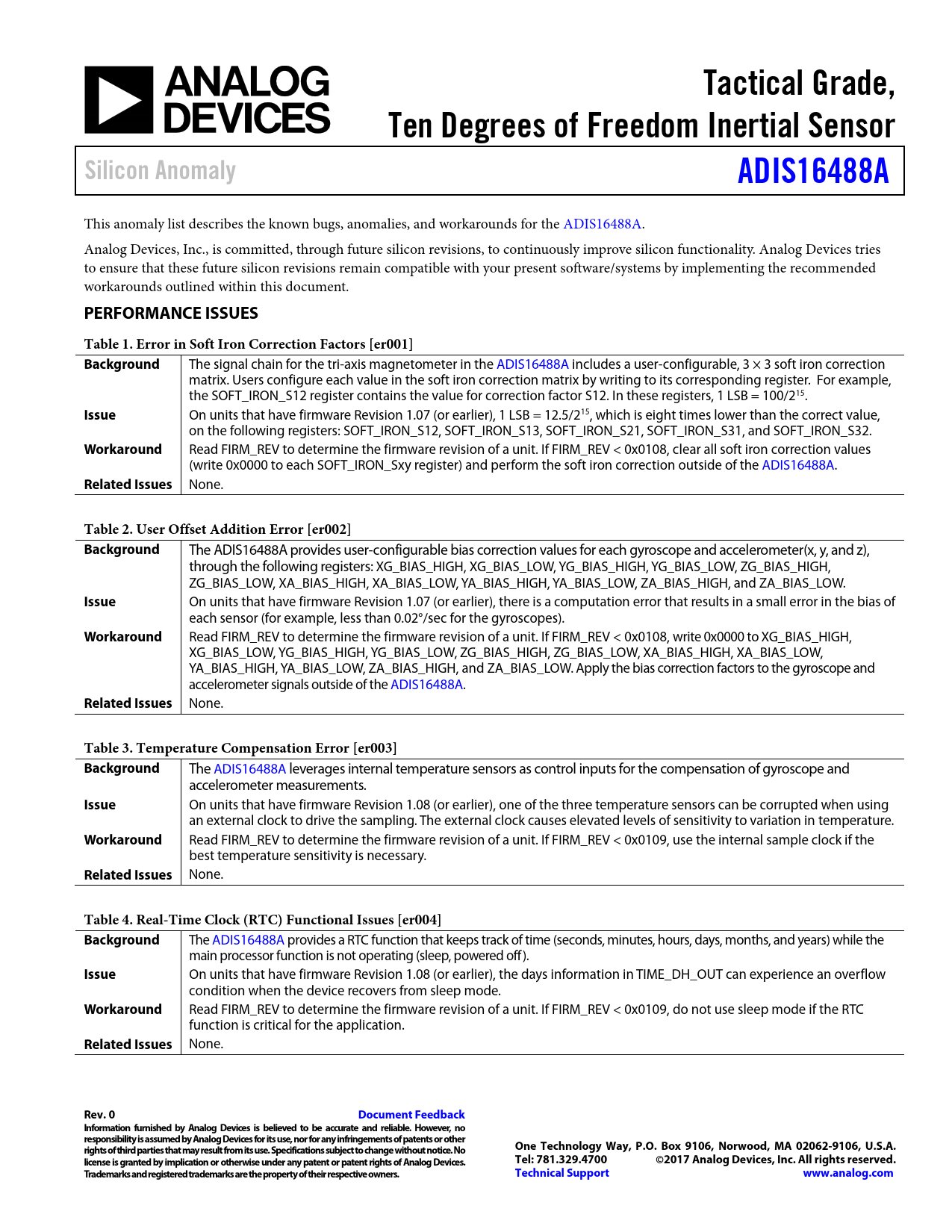 This anomaly list describes the known bugs, anomalies, and workarounds for the ADIS16488A. Analog Devices, Inc., is committed, through future silicon revisions, to continuously improve silicon functionality. Analog Devices tries to ensure that these future silicon revisions remain compatible with your present software/systems by implementing the recommended workarounds outlined within this document.