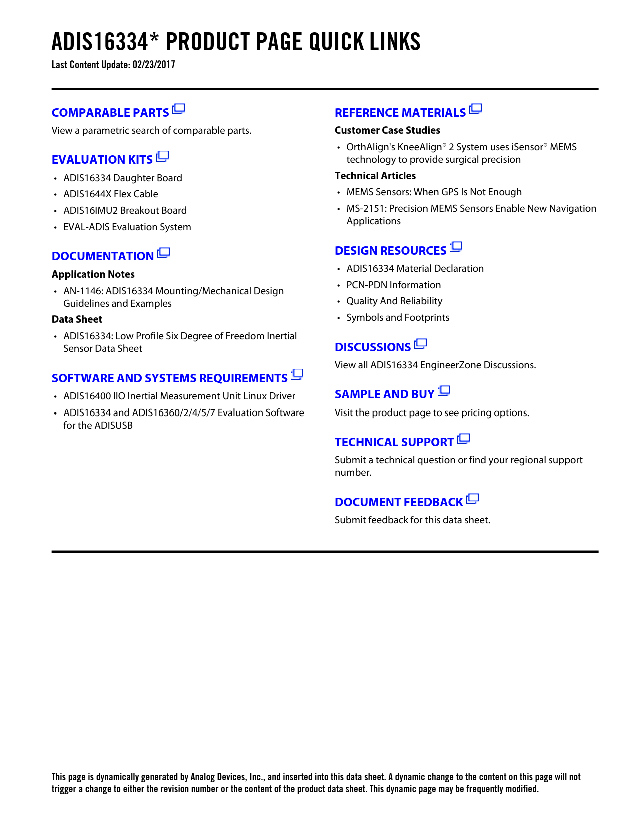 ADIS16334* PRODUCT PAGE QUICK LINKS Last Content Update: 02/23/2017COMPARABLE PARTSREFERENCE MATERIALS View a parametric search of comparable parts. Customer Case Studies • OrthAlign's KneeAlign® 2 System uses iSensor® MEMS EVALUATION KITS technology to provide surgical precision • ADIS16334 Daughter Board Technical Articles • ADIS1644X Flex Cable • MEMS Sensors: When GPS Is Not Enough • ADIS16IMU2 Breakout Board • MS-2151: Precision MEMS Sensors Enable New Navigation Applications • EVAL-ADIS Evaluation System DOCUMENTATIONDESIGN RESOURCES • ADIS16334 Material Declaration Application Notes • PCN-PDN Information • AN-1146: ADIS16334 Mounting/Mechanical Design Guidelines and Examples • Quality And Reliability Data Sheet • Symbols and Footprints • ADIS16334: Low Profile Six Degree of Freedom Inertial Sensor Data Sheet DISCUSSIONS View all ADIS16334 EngineerZone Discussions. SOFTWARE AND SYSTEMS REQUIREMENTS • ADIS16400 IIO Inertial Measurement Unit Linux Driver SAMPLE AND BUY • ADIS16334 and ADIS16360/2/4/5/7 Evaluation Software Visit the product page to see pricing options. for the ADISUSB TECHNICAL SUPPORT Submit a technical question or find your regional support number. DOCUMENT FEEDBACK Submit feedback for this data sheet. This page is dynamically generated by Analog Devices, Inc., and inserted into this data sheet. A dynamic change to the content on this page will not trigger a change to either the revision number or the content of the product data sheet. This dynamic page may be frequently modified. Document Outline Features Applications General Description Functional Block Diagram Revision History Specifications Timing Specifications Timing Diagrams Absolute Maximum Ratings ESD Caution Pin Configuration and Function Descriptions Typical Performance Characteristics Theory of Operation Gyroscopes Accelerometers Data Sampling and Processing Calibration User Interface SPI Interface Basic Operation Reading Sensor Data Burst Read Function Memory Map Output Data Registers Gyroscopes Accelerometers Internal Temperature Measurements Device Configuration Dual Memory Structure Digital Processing Configuration Sample Rate Input Clock Configuration Digital Filtering Dynamic Range Optimizing Accuracy Automatic Bias Correction Manual Bias Correction Restoring Factory Calibration Point-of-Percussion/Linear-g Compensation System Tools Global Commands General-Purpose I/O Data Ready I/O Indicator Self-Test Memory Test Status Device Identification Flash Memory Management Alarms Static Alarm Use Dynamic Alarm Use Alarm Reporting Alarm Example Applications Information ADIS16334/PCBZ Installation Mounting Approaches Outline Dimensions Ordering Guide