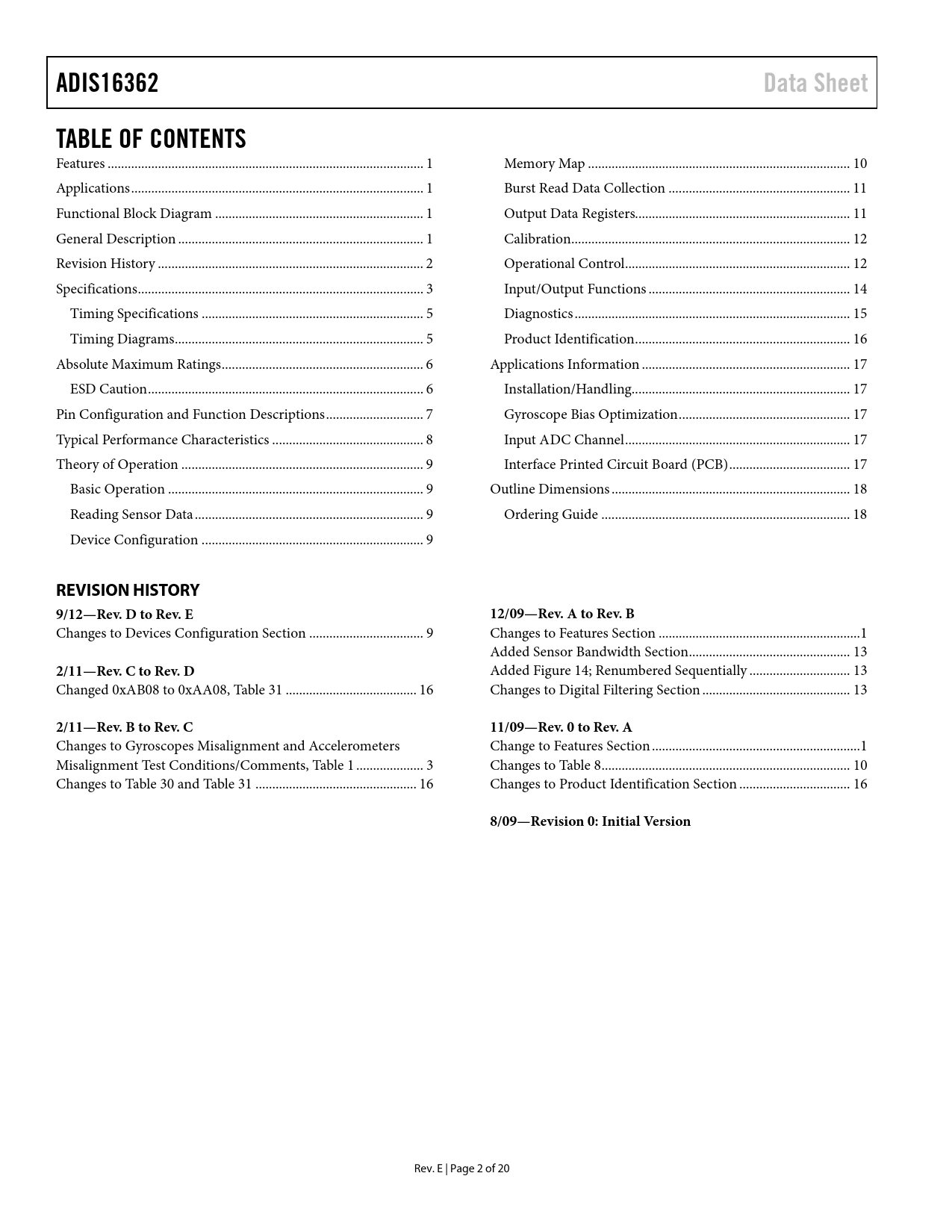 link to page 1 link to page 1 link to page 1 link to page 1 link to page 3 link to page 4 link to page 6 link to page 6 link to page 7 link to page 7 link to page 8 link to page 9 link to page 10 link to page 10 link to page 10 link to page 10 link to page 11 link to page 12 link to page 12 link to page 13 link to page 13 link to page 15 link to page 16 link to page 17 link to page 18 link to page 18 link to page 18 link to page 18 link to page 18 link to page 19 link to page 19 ADIS16362Data SheetTABLE OF CONTENTS Features .. 1 Memory Map .. 10 Applications ... 1 Burst Read Data Col ection .. 11 Functional Block Diagram .. 1 Output Data Registers.. 11 General Description ... 1 Calibration... 12 Revision History ... 2 Operational Control ... 12 Specifications ... 3 Input/Output Functions .. 14 Timing Specifications .. 5 Diagnostics .. 15 Timing Diagrams .. 5 Product Identification .. 16 Absolute Maximum Ratings .. 6 Applications Information .. 17 ESD Caution .. 6 Installation/Handling... 17 Pin Configuration and Function Descriptions ... 7 Gyroscope Bias Optimization ... 17 Typical Performance Characteristics ... 8 Input ADC Channel ... 17 Theory of Operation .. 9 Interface Printed Circuit Board (PCB) .. 17 Basic Operation .. 9 Outline Dimensions ... 18 Reading Sensor Data .. 9 Ordering Guide .. 18 Device Configuration .. 9 REVISION HISTORY 9/12—Rev. D to Rev. E12/09—Rev. A to Rev. B Changes to Devices Configuration Section .. 9 Changes to Features Section .. 1 Added Sensor Bandwidth Section .. 13 2/11—Rev. C to Rev. D Added Figure 14; Renumbered Sequentially .. 13 Changed 0xAB08 to 0xAA08, Table 31 ... 16 Changes to Digital Filtering Section .. 13 2/11—Rev. B to Rev. C11/09—Rev. 0 to Rev. A Changes to Gyroscopes Misalignment and Accelerometers Change to Features Section .. 1 Misalignment Test Conditions/Comments, Table 1 .. 3 Changes to Table 8 .. 10 Changes to Table 30 and Table 31 .. 16 Changes to Product Identification Section ... 16 8/09—Revision 0: Initial Version Rev. E | Page 2 of 20 Document Outline Features Applications Functional Block Diagram General Description Revision History Specifications Timing Specifications Timing Diagrams Absolute Maximum Ratings ESD Caution Pin Configuration and Function Descriptions Typical Performance Characteristics Theory of Operation Basic Operation Reading Sensor Data Device Configuration Memory Map Burst Read Data Collection Output Data Registers Calibration Manual Bias Calibration Gyroscope Automatic Bias Null Calibration Gyroscope Precision Automatic Bias Null Calibration Restoring Factory Calibration Linear Acceleration Bias Compensation (Gyroscope) Operational Control Global Commands Internal Sample Rate Power Management Sensor Bandwidth Digital Filtering Dynamic Range Input/Output Functions General-Purpose I/O Input Clock Configuration Data Ready I/O Indicator Auxiliary DAC Diagnostics Self-Test Memory Test Status Alarm Registers Product Identification Applications Information Installation/Handling Gyroscope Bias Optimization Input ADC Channel Interface Printed Circuit Board (PCB) Outline Dimensions Ordering Guide